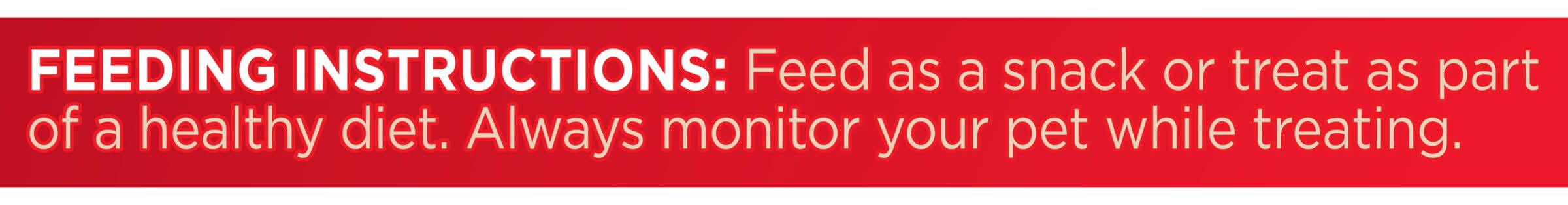 Feeding instructions: feed as a snack or treat, as part of a healthy diet. break into small pieces for small dogs. always monitor your pet while treating.