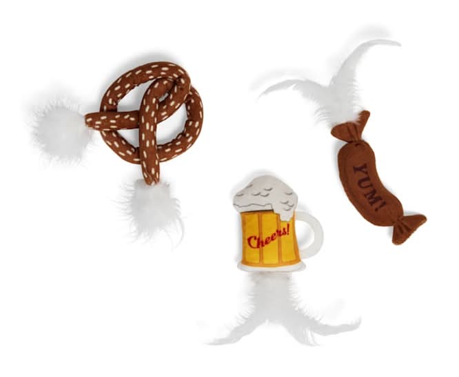 Your kitty will be feeling all of the holiday cheer(s) when they're pouncing and playing with this food-themed plush cat toy set from Merry Makings. This set of 3 toys includes catnip-filled mini pretzel, beer mug, and sausage toys, making for a super fun and festive way for your cat to play. Size: 0.09 lb