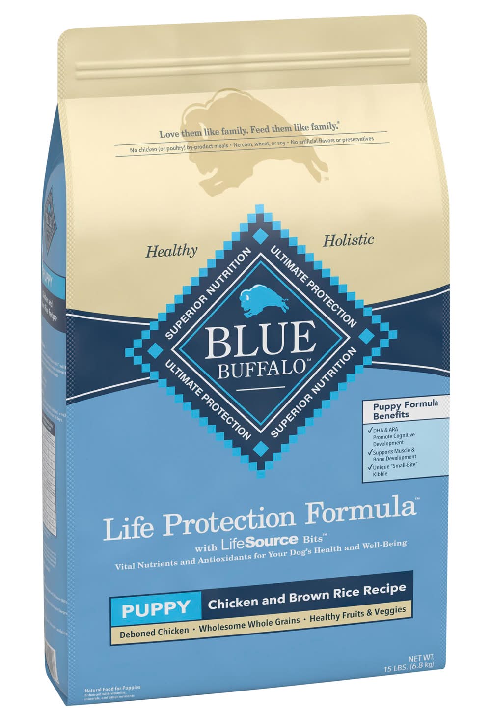 BLUE Life Protection Formula Puppy Food is formulated to help your new best friend thrive. This dry dog food is made with the finest natural ingredients -- including real chicken, wholesome whole grains, and healthy fruits and veggies -- to support your puppy's health and wellness. It contains DHA and ARA, fatty acids found in mother's milk, to promote cognitive development. This puppy dog food also features antioxidant-rich LifeSource Bits to support immune system health. Like all Blue Buffalo dog food recipes, BLUE Life Protection Formula contains no chicken (or poultry) by-product meals. This natural dry dog food is also free of corn, wheat, soy, artificial flavors, and preservatives. • Size: 15.16 lb • Blue Buffalo Company, Ltd., 11 River Road, Wilton, CT, 06897