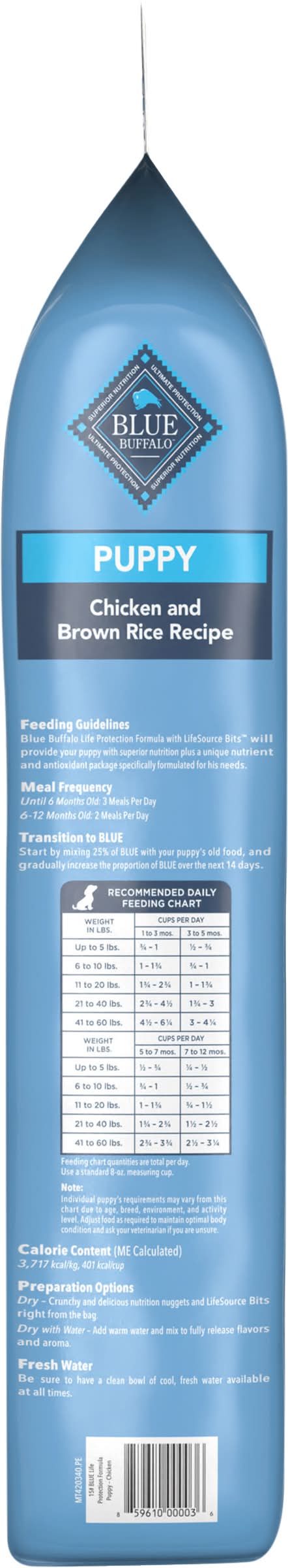 Feeding guidelines: blue life protection formula with lifesource bits will provide your puppy with superior nutrition plus a unique nutrient and antioxidant package specifically formulated for his needs. meal frequency: small breed: 1 meal per day. medium/large breed: 2 meals per day. transition to blue: start by mixing 25% of blue with your puppy‚äôs old food, and gradually increase the proportion of blue over the next 14 days. recommended daily feeding chart: 1 to 3 mos. (weight in lbs): up to 5 lbs: 3/4 - 1 cups per day (use a standard 8-oz. measuring cup): 3 to 5 mos. (weight in lbs): up to 5 lbs: 1/2 - 3/4 cups per day (use a standard 8-oz. measuring cup); 1 to 3 mos. (weight in lbs): 6 to 10 lbs: 1 - 1-3/4 cups per day (use a standard 8-oz. measuring cup): 3 to 5 mos. (weight in lbs): 6 to 10 lbs: 3/4 ‚äì 1 cups per day (use a standard 8-oz. measuring cup); 1 to 3 mos. (weight in lbs): 11 to 20 lbs: 1-3/4 - 2-3/4 cups per day (use a standard 8-oz. measuring cup): 3 to 5 mos. (weight in lbs): 11 to 20 lbs: 1 - 1-3/4 cups per day (use a standard 8-oz. measuring cup); 1 to 3 mos. (weight in lbs): 21 to 40 lbs: 2-3/4 - 4-1/2 cups per day (use a standard 8-oz. measuring cup): 3 to 5 mos. (weight in lbs): 21 to 40 lbs: 2-3/4 - 4-1/2 cups per day (use a standard 8-oz. measuring cup); 1 to 3 mos. (weight in lbs): 41 to 60 lbs: 4-1/2 - 6-1/4 cups per day (use a standard 8-oz. measuring cup): 3 to 5 mos. (weight in lbs): 41 to 60 lbs: 3 - 4-1/4 cups per day (use a standard 8-oz. measuring cup); 5 to 7 mos. (weight in lbs): up to 5 lbs: 1/2 ‚äì 3/4 cups per day (use a standard 8-oz. measuring cup): 7 to 12 mos. (weight in lbs): up to 5 lbs: 1/4 - 1/2 cups per day (use a standard 8-oz. measuring cup); 5 to 7 mos. (weight in lbs): 6 to 10 lbs: 3/4 - 1 cups per day (use a standard 8-oz. measuring cup): 7 to 12 mos. (weight in lbs): 6 to 10 lbs: 1/2 ‚äì 3/4 cups per day (use a standard 8-oz. measuring cup); 5 to 7 mos. (weight in lbs): 11 to 20 lbs: 1 - 1-3/4 cups per day (use a standard 8-oz. measuring cup): 7 to 12 mos. (weight in lbs): 11 to 20 lbs: 3/4 - 1-1/2 cups per day (use a standard 8-oz. measuring cup); 5 to 7 mos. (weight in lbs): 21 to 40 lbs: 1-3/4 - 2-3/4 cups per day (use a standard 8-oz. measuring cup): 7 to 12 mos. (weight in lbs): 21 to 40 lbs: 1-1/2 - 2-1/2 cups per day (use a standard 8-oz. measuring cup); 5 to 7 mos. (weight in lbs): 41 to 60 lbs: 2-3/4 - 3-3/4 cups per day (use a standard 8-oz. measuring cup): 7 to 12 mos. (weight in lbs): 41 to 60 lbs: 2-1/2 - 3-1/4 cups per day (use a standard 8-oz. measuring cup). note: individual puppy's requirements may vary from this chart due to age, breed, environment and activity level. adjust food as required to maintain optimal body condition and ask your veterinarian if you are unsure. preparation options: dry - crunchy and delicious nutrition nuggets and lifesource bits right from the bag. dry with water - add warm water and mix to fully release flavors and aroma. fresh water: be sure to have a clean bowl of cool, fresh water available at all times.