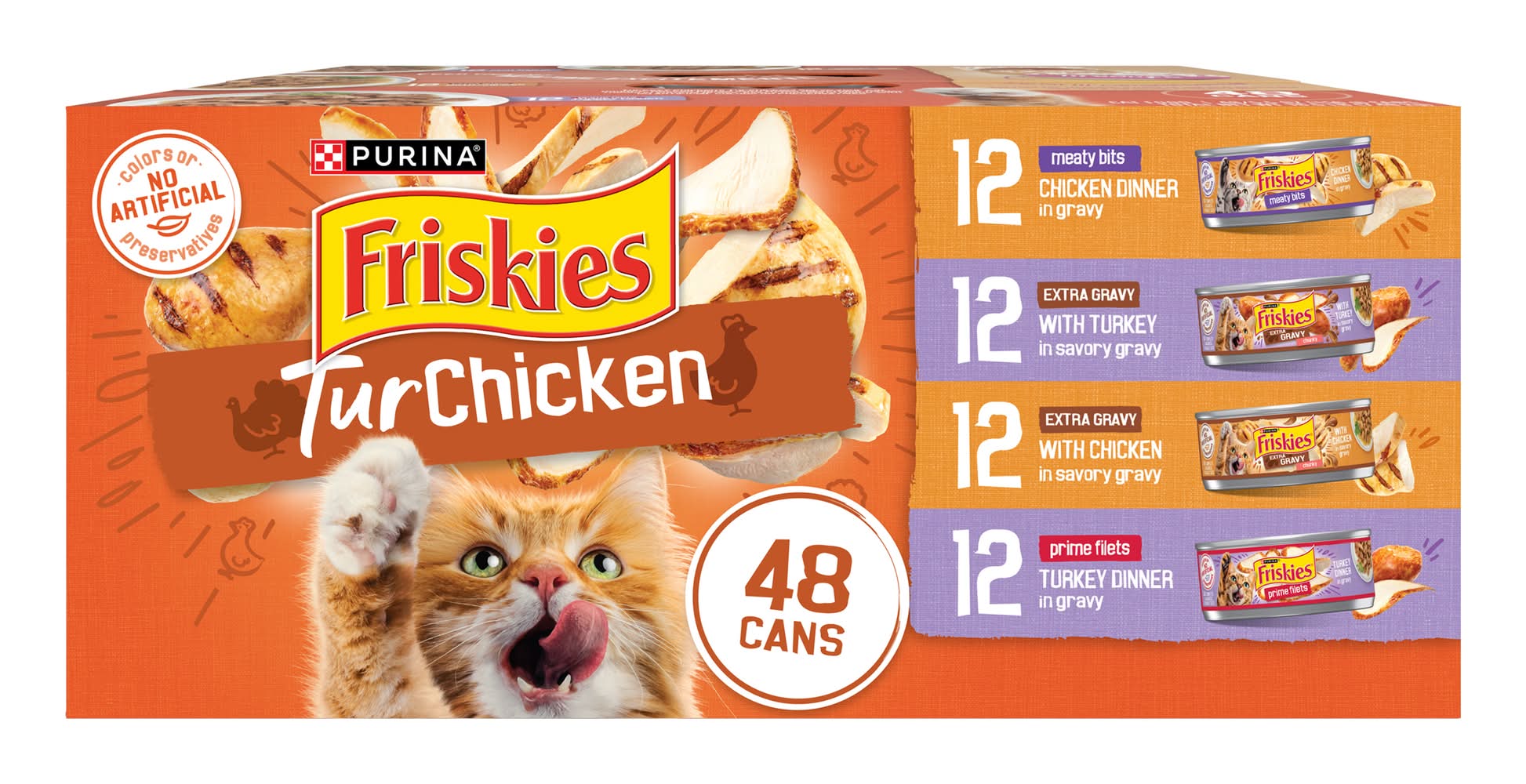 Give your cat the nutrition and flavors she craves by feeding her a different meal each day, rotating between the four flavors in this Purina Friskies TurChicken adult moist cat food variety pack. These canned cat food varieties, including Meaty Bits Chicken Dinner in Gravy, Extra Gravy Chunky With Turkey in Savory Gravy, Prime filets With Turkey Dinner in Gravy and Extra Gravy Chunky With Chicken in Savory Gravy, feature rich gravies, and meaty chunks for meals full of texture, flavor and aroma for your feline friend while providing for greater versatility in her diet. Feed these Friskies cat food recipes exclusively, or let her try other varieties of Friskies wet or dry cat foods to give your furry family member even more menu options. Crafted with 100 percent complete and balanced nutrition with no artificial colors or preservatives, these varieties contain the vitamins and minerals your cat needs to flourish. Pop open a pull-tab can today. • Pack size: 48 • Size: 18.80 lb