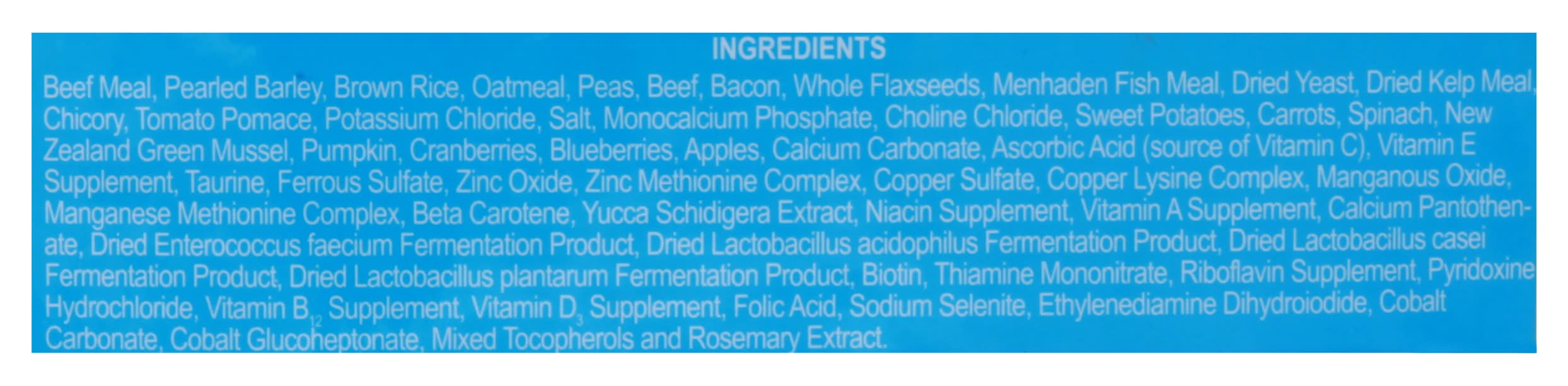 Ingredients: Beef Meal, Pearled Barley, Brown Rice, Oatmeal, Peas, Beef, Bacon, Whole Flaxseeds, Menhaden Fish Meal, Dried Yeast, Dried Kelp Meal Chicory, Tomato Pomace, Potassium Chloride, Salt, Monocalcium Phosphate, Choline Chloride, Sweet Potatoes, Carrots Spinach, New Zealand Green Mussel, Pumpkin, Cranberries, Blueberries, Apples, Calcium Carbonate, Ascorbic Acid (Source of Vitamin C), Vitamin E Supplement, Taurine, Ferrous Sulfate, Zinc Oxide, Zinc Methionine Complex, Copper Sulfate, Copper Lysine Complex, Manganous Oxide, Manganese Methionine Complex, Beta Carotene, Yucca Schidigera Extract, Niacin Supplement, Vitamin A Supplement, Calcium Pantothenate, Dried Enterococcus Faecium Fermentation Product, Dried Lactobacillus Acidophilus Fermentation Product, Dried Lactobacillus Casei Fermentation Product, Dried Lactobacillus Plantarum Fermentation Product, Biotin, Thiamine Mononitrate, Riboflavin Supplement Pyridoxine Hydrochloride, Vitamin B12, Supplement, Vitamin D3, Supplement, Folic Acid, Sodium Selenite, Ethylenediamine Dihydroiodide, Cobalt Carbonate Cobalt Glucoheptonate Mixed Tocopherols and Rosemary Extract Contains: Barley, Oat, Fish, Molluscan Shellfish, Mussels