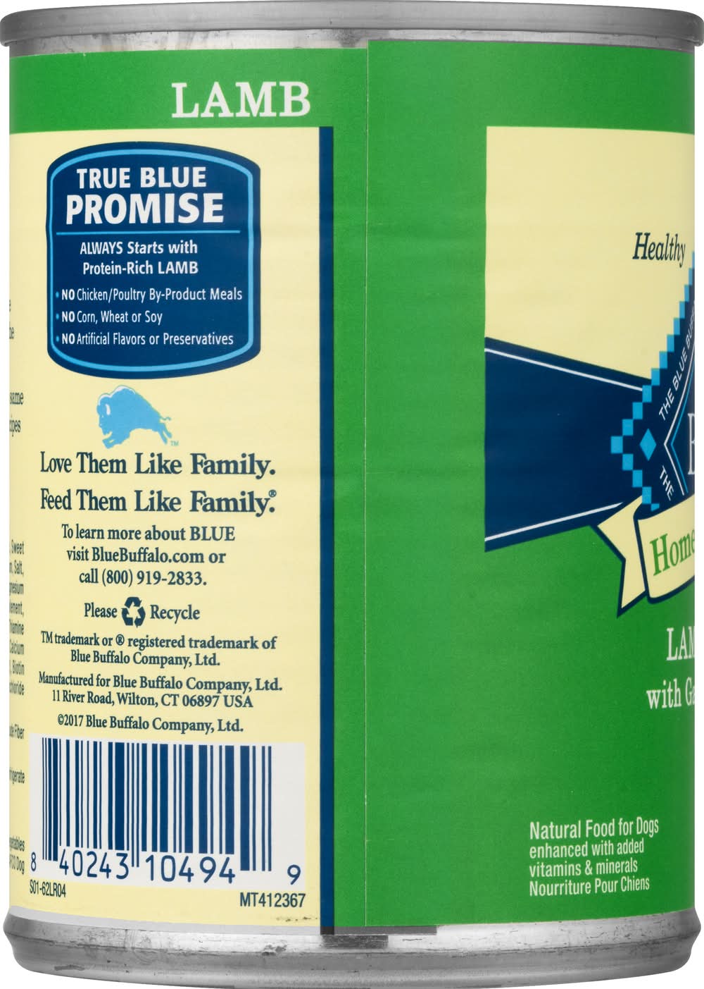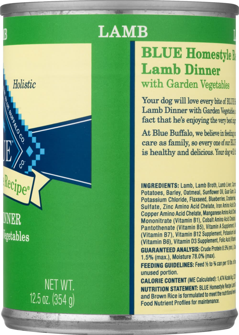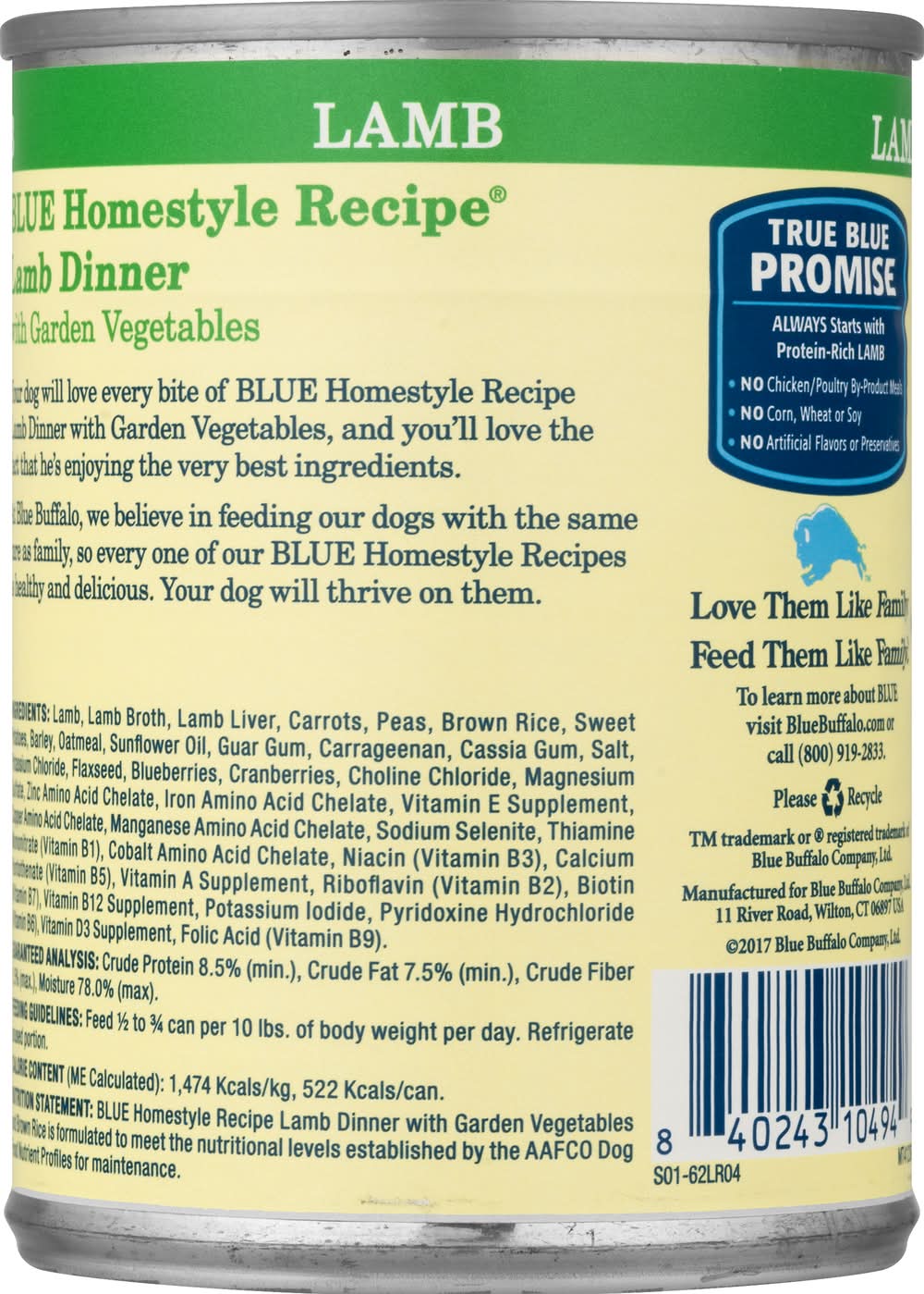 Natural food for dogs enhanced with added vitamins & minerals. True Blue Promise: Always start with protein-rich lamb. No chicken/poultry by-product meals. No corn, wheat or soy. No artificial flavors or preservatives. Healthy holistic. Your dog will love every bite of Blue Homestyle Recipe Lamb Dinner with Garden Vegetables, and you'll love the fact that he's enjoying the very best ingredients. At Blue Buffalo, we believe in feeding our dogs with the same care as family, so every one of our Blue Homestyle Recipes is healthy and delicious. Your dog will thrive on them. Love them like family. Feed them like family. Please recycle. • Size: 0.89 lb • Packaging: Reusable