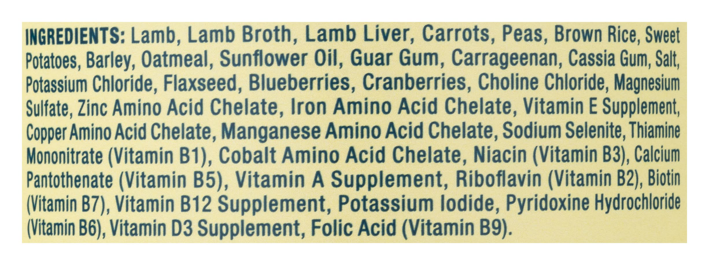 Ingredients: Lamb, Lamb Broth, Lamb Liver, Carrots, Peas, Brown Rice, Sweet Potatoes, Barley, Oatmeal, Sunflower Oil, Guar Gum, Carrageenan, Cassia Gum, Salt, Potassium Chloride, Flaxseed, Blueberries, Cranberries, Choline Chloride, Magnesium Sulfate, Zinc Amino Acid Chelate, Iron Amino Acid Chelate, Vitamin E Supplement, Copper Amino Acid Chelate, Manganese Amino Acid Chelate, Sodium Selenite, Thiamine Mononitrate (Vitamin B1), Cobalt Amino Acid Chelate, Niacin (Vitamin B3), Calcium Pantothenate (Vitamin B5), Vitamin A Supplement, Riboflavin (Vitamin B2), Biotin (Vitamin B7), Vitamin B12 Supplement, Potassium Iodide, Pyridoxine Hydrochloride (Vitamin B6), Vitamin D3 Supplement, Folic Acid (Vitamin B9)