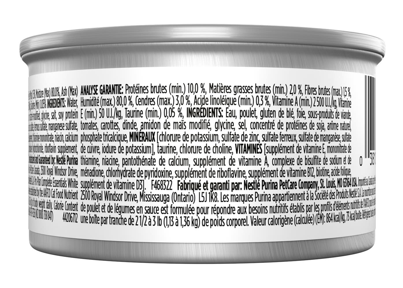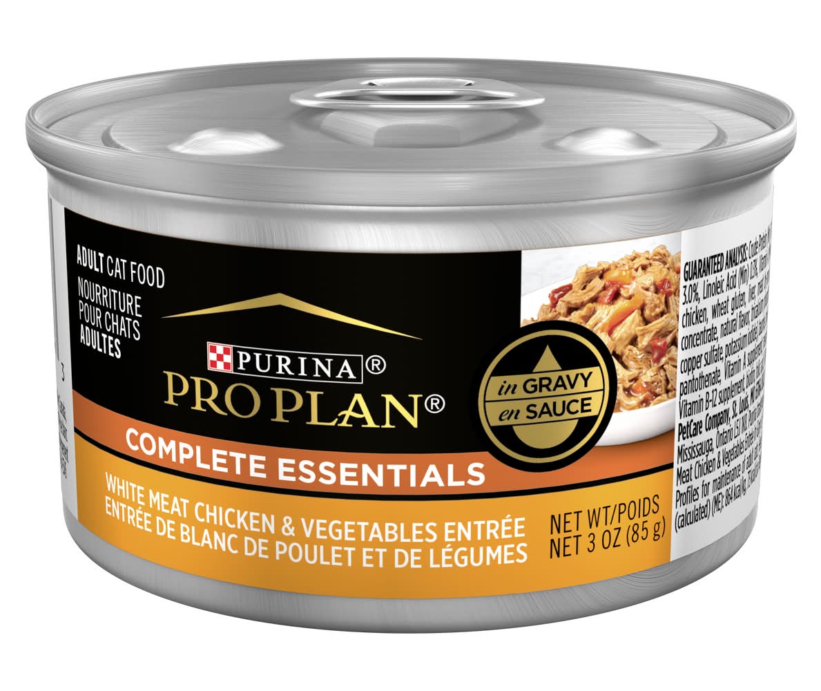 Treat your cat right with Purina Pro Plan COMPLETE ESSENTIALS White Meat Chicken and Vegetable Entree in Gravy adult wet cat food. This premium cat food features real white meat chicken complemented with vegetables, and every high-quality ingredient is carefully chosen for a specific purpose. Omega-6 fatty acids and vitamin A in every cat wet food serving nourish her skin and coat, and antioxidants help to support a healthy immune system. Plus, a high protein level in this Purina cat food entree helps her maintain lean muscle, and vitamin A and taurine support her healthy vision. We formulate our soft cat food to provide 100 percent complete and balanced nutrition for adult cats in a delicious canned cat food formula with no artificial colors or preservatives. A rich gravy adds flavor and moisture, while the tender texture and delectable taste combine for a mealtime option that's as tasty as it is nutritious. Size: Adult
