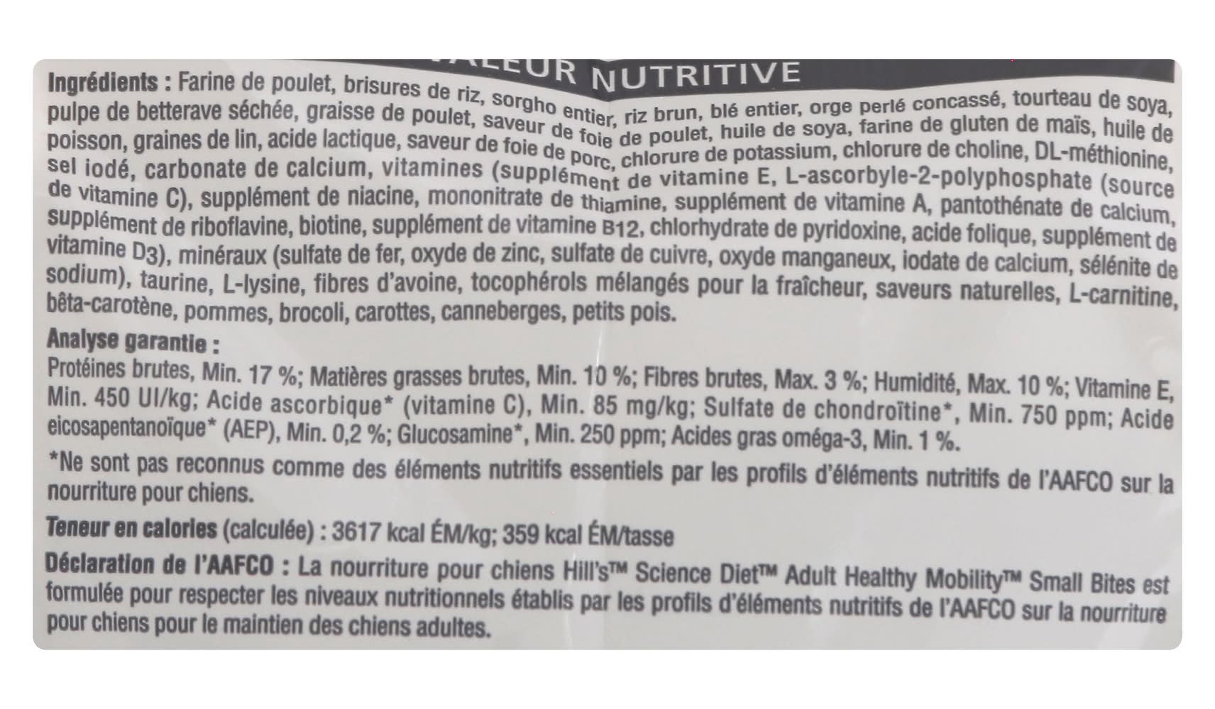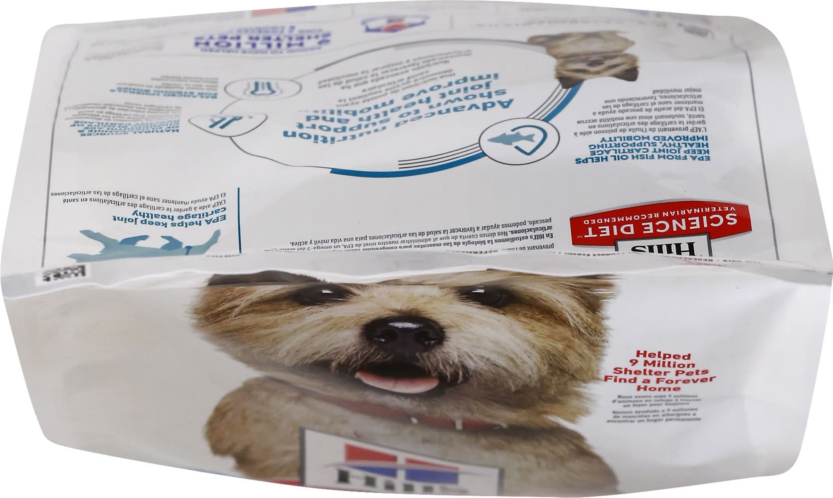 Premium. No artificial flavors. Not artificially preserved. No synthetic colors. Chicken ingredient no 1. Natural ingredients. No chicken by-product meal. Clinically proven antioxidants, vitamin C + E, for a healthy immune system. Veterinarian recommended. Nutrition to improve mobility in 30 days (USA study). Cutting edge food science. At Hill's we study pets' biology to understand how nutrition impacts joints. We learned that feeding our level of EPA, an omega-3 from fish oil, can help support joint health for a mobile & active life. EPA helps keep joint cartilage healthy. Advanced nutrition shown to support joint health and improve mobility. EPA from fish oil helps keep joint cartilage healthy, supporting improved mobility. Natural sources of glucosamine & chondroitin are building blocks of healthy cartilage. Balanced minerals for strong bones. US veterinarians' no 1 recommended. 100% satisfaction guarantee or your money back. Size: 4.41 lb