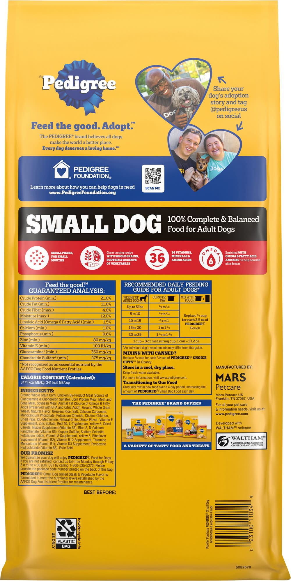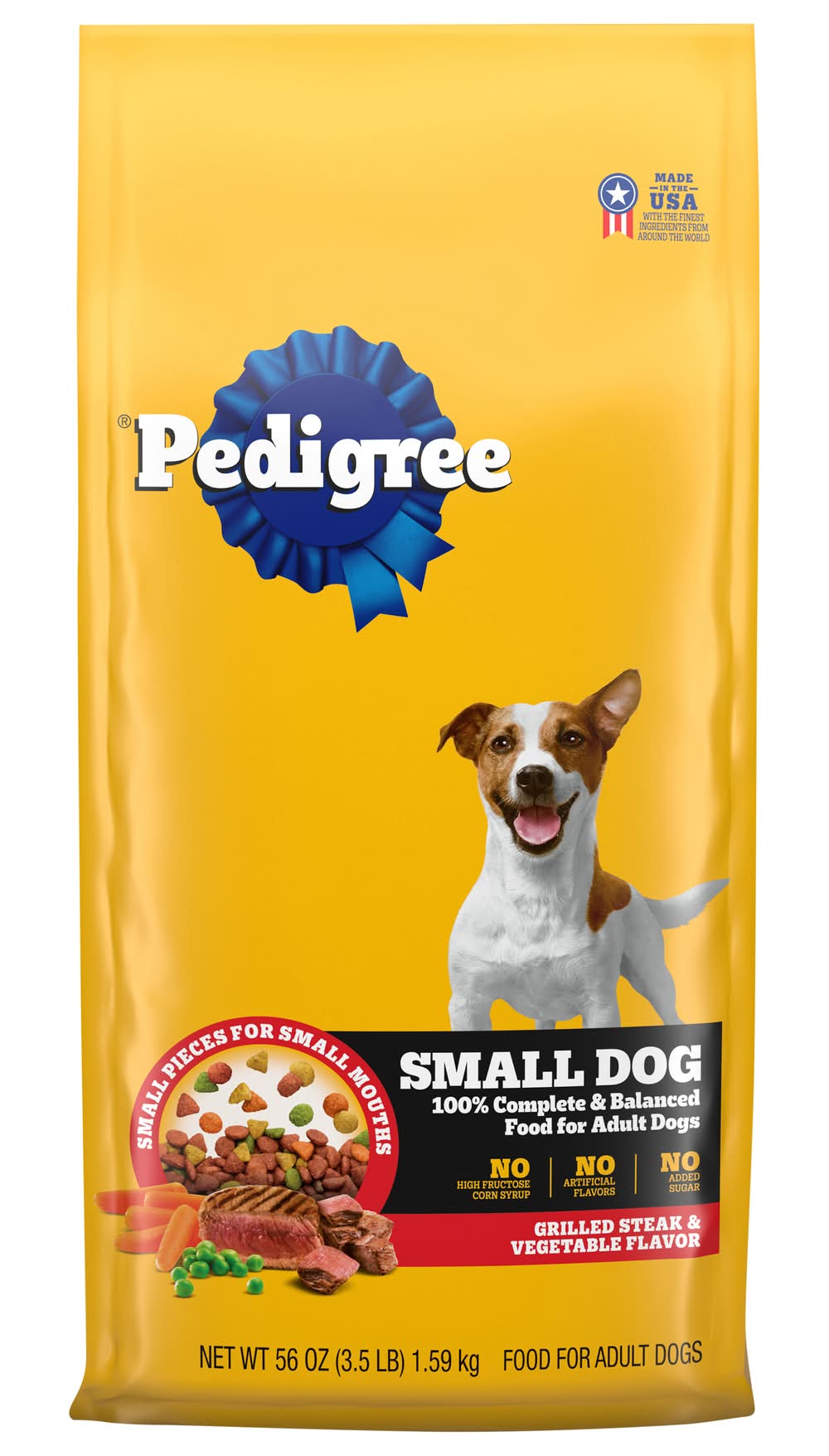 100% Complete & balanced food for adult dogs. No artificial flavors. No added sugar. Small pieces for small mouths. No high fructose corn syrup. No added sugar. Feed the good. Adopt. The pedigree brand believes all dogs make the world a better place. Every dog deserves a loving home. Great tasting recipe with whole grains, protein & accents of vegetables. 36 vitamins, minerals & amino acids. Omega 6: enriched with omega 6 fatty acid and zinc to help nourish skin & coat. Our promise: we guarantee your dog will enjoy pedigree food for dogs. Developed with waltham science. Waltham a world leading authority on pet care and nutrition. The pedigree brand offers a variety of tasty food and treat. • Size: 3.69 lb • Mars Petcare US, Franklin TN 37067