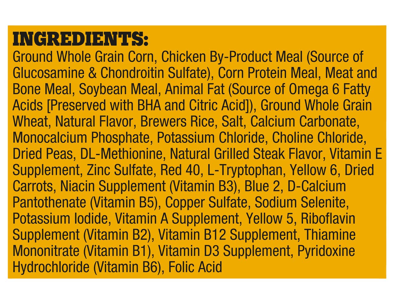 Ingredients: Ground Whole Grain Corn, Chicken By-Product Meal (Source of Glucosamine & Chondroitin Sulfate), Corn Protein Meal, Meat and Bone Meal, Soybean Meal, Animal Fat (Source of Omega 6 Fatty Acids [Preserved with BHA and Citric Acid)), Ground Whole Grain Wheat, Natural Flavor, Brewers Rice, Salt, Calcium Carbonate, Monocalcium Phosphate, Potassium Chloride, Choline Chloride, Dried Peas, DL-Methionine, Natural Grilled Steak Flavor, Vitamin E Supplement, Zinc Sulfate, Red 40, L-Tryptophan, Yellow 6, Dried Car Carrots, Niacin Supplement (Vitamin B3), Blue 2, D-Calcium Pantothenate (Vitamin B5), Copper Sulfate, Sodium Selenite, Potassium Lodide, Vitamin A Supplement, Yellow 5, Riboflavin Supplement (Vitamin B2), Vitamin B12 Supplement, Thiamine Mononitrate (Vitamin B1), Vitamin D3 Supplement, Pyridoxine Hydrochloride (Vitamin B6), Folic Acid Contains: Corn, Soybeans, Wheat
