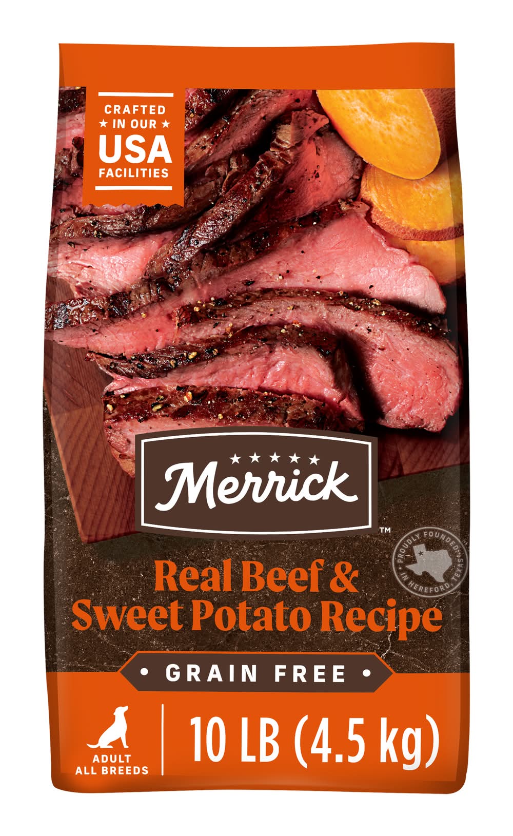 Serve your dog food they will love with Merrick Grain Free Dry Dog Food, Real Beef And Sweet Potato Recipe. Real deboned beef is the first ingredient in this real meat dog food. This holistic blend of kibble provides a high protein dog food option that helps maintain lean muscle mass and energy levels. With 63% protein and healthy fat ingredients and 37% produce, fiber, vitamins, minerals and other natural ingredients, this complete and balanced dog food is rich in protein. This adult dog food also contains omega fatty acids to help support your dog's healthy skin and coat. Additionally, this premium kibble helps maintain healthy hips and joints by providing high levels of glucosamine and chondroitin for dogs. Wholesome ingredients are prioritized in this grain free dog food, and so it is made without corn, wheat, soy, gluten or artificial colors, flavors, or preservatives. Merrick dog food recipes are proudly crafted in USA facilities. Size: 10.16 lb