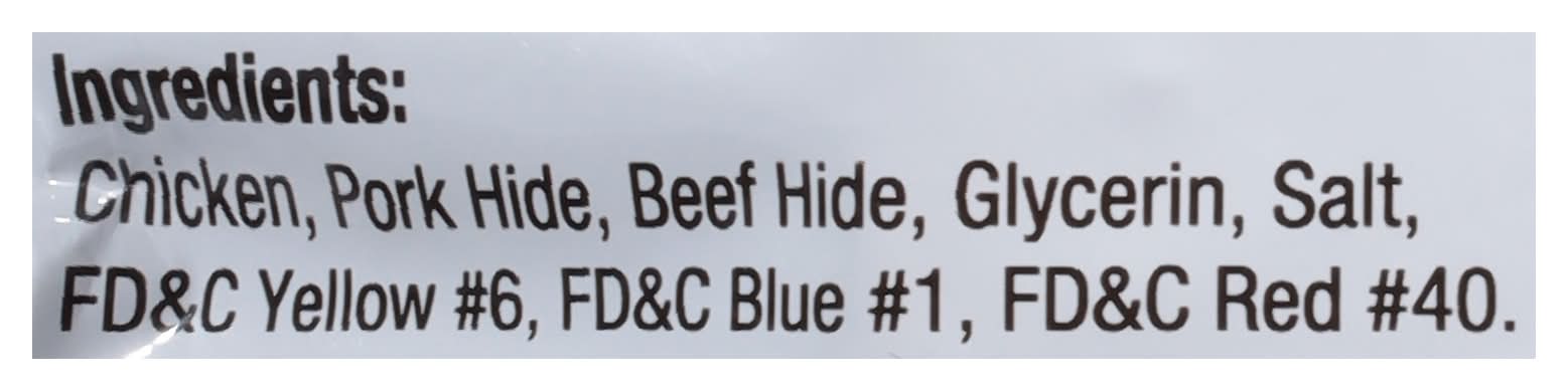 Ingredients: Chicken, Pork Hide, Beef Hide, Glycerin, Salt, FD&C Yellow 6, FD&C Blue 1, FD&C Red 40