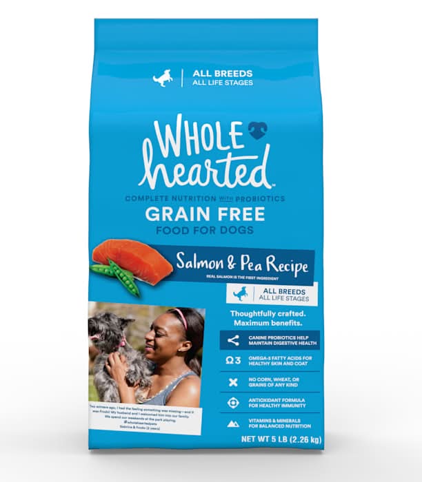 The WholeHearted Grain Free All Life Stages Salmon and Pea Recipe Dry Dog Food satisfies your pup with scrumptious flavors while providing them complete, balanced nutrition. Fill your pet's bowl with Omega-3 fatty acids, canine probiotics, antioxidants, and absolutely zero corn, wheat, or grains. Size: 5.00 lb