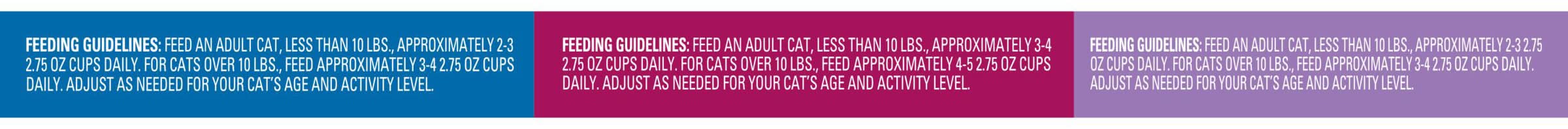 Feeding guidelines: feed an adult cat, less than 10 lb, approximately 3-4 2.75 oz cups daily. for cats over 10 lb, feed approximately 4-5 2.75 oz cups daily. adjust as needed for your cat's age and activity level. - directions: feeding guidelines: feed an adult cat, less than 10 lb, approximately 3-4 2.75 oz cups daily. for cats over 10 lb, feed approximately 4-5 2.75 oz cups daily. adjust as needed for your cat's age and activity level.