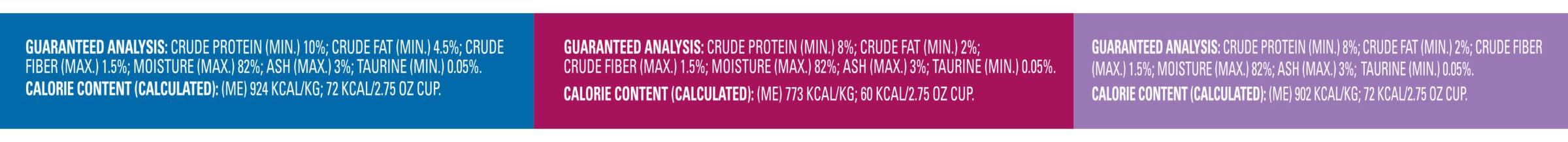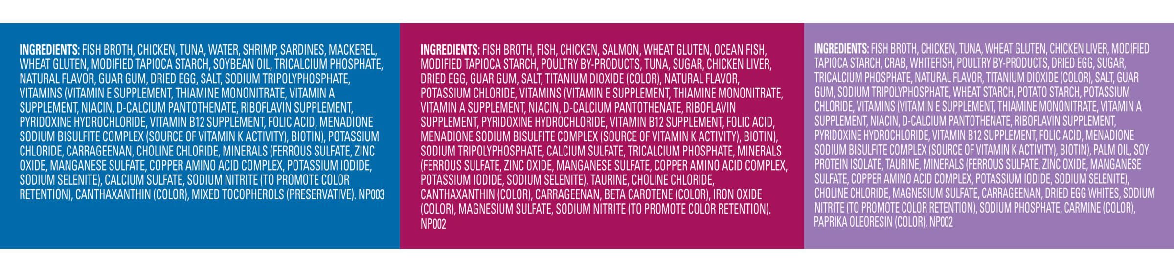 Ingredients: Fish Broth, Fish, Chicken, Salmon, Wheat Gluten, Ocean Fish, Modified Tapioca Starch, Poultry By-Products, Tuna, Sugar, Chicken Liver, Dried Egg, Guar Gum, Salt, Titanium Dioxide (Color), Natural Flavor, Potassium Chloride, Vitamins (Vitamin E Supplement, Thiamine Mononitrate, Vitamin A Supplement, Niacin, D-Calcium Pantothenate, Riboflavin Supplement, Pyridoxine Hydrochloride, Vitamin B12 Supplement, Folic Acid, Menadione Sodium Bisulfite Complex (Source Of Vitamin K Activity), Biotin), Sodium Tripolyphosphate, Calcium Sulfate, Tricalcium Phosphate, Minerals (Ferrous Sulfate, Zinc Oxide, Manganese Sulfate, Copper Amino Acid Complex, Potassium Iodide, Sodium Selenite), Taurine, Choline Chloride, Canthaxanthin (Color), Carrageenan, Beta Carotene (Color), Iron Oxide (Color), Magnesium Sulfate, Sodium Nitrite (To Promote Color Retention).