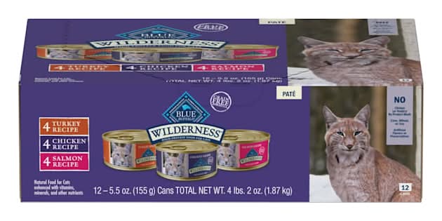 Like their ancestors before them, cats were born to love meat. That's why BLUE Wilderness wet cat food is packed with the meat cats crave. Starting with delicious real chicken, salmon, or turkey, BLUE Wilderness Chicken, Salmon, and Turkey Pates provide natural nutrition while satisfying your cat's wild side. Elevate your cat's diet by serving the high-quality ingredients of BLUE Wilderness wet cat food in an irresistibly smooth pate. This grain-free recipe offers your cat essential moisture and balanced nutrition with protein, fat, carbohydrates, and fiber to help them thrive. A convenient 12-count variety pack makes it even easier to keep your cat satisfied. BLUE Wilderness cat food is backed by the True BLUE Promise and always starts with real meat first. It contains no chicken or poultry by-product meals, no corn, wheat, or soy, and no artificial flavors or preservatives, so you can feel good about mealtime. • Pack size: 12 • Size: 4.89 lb