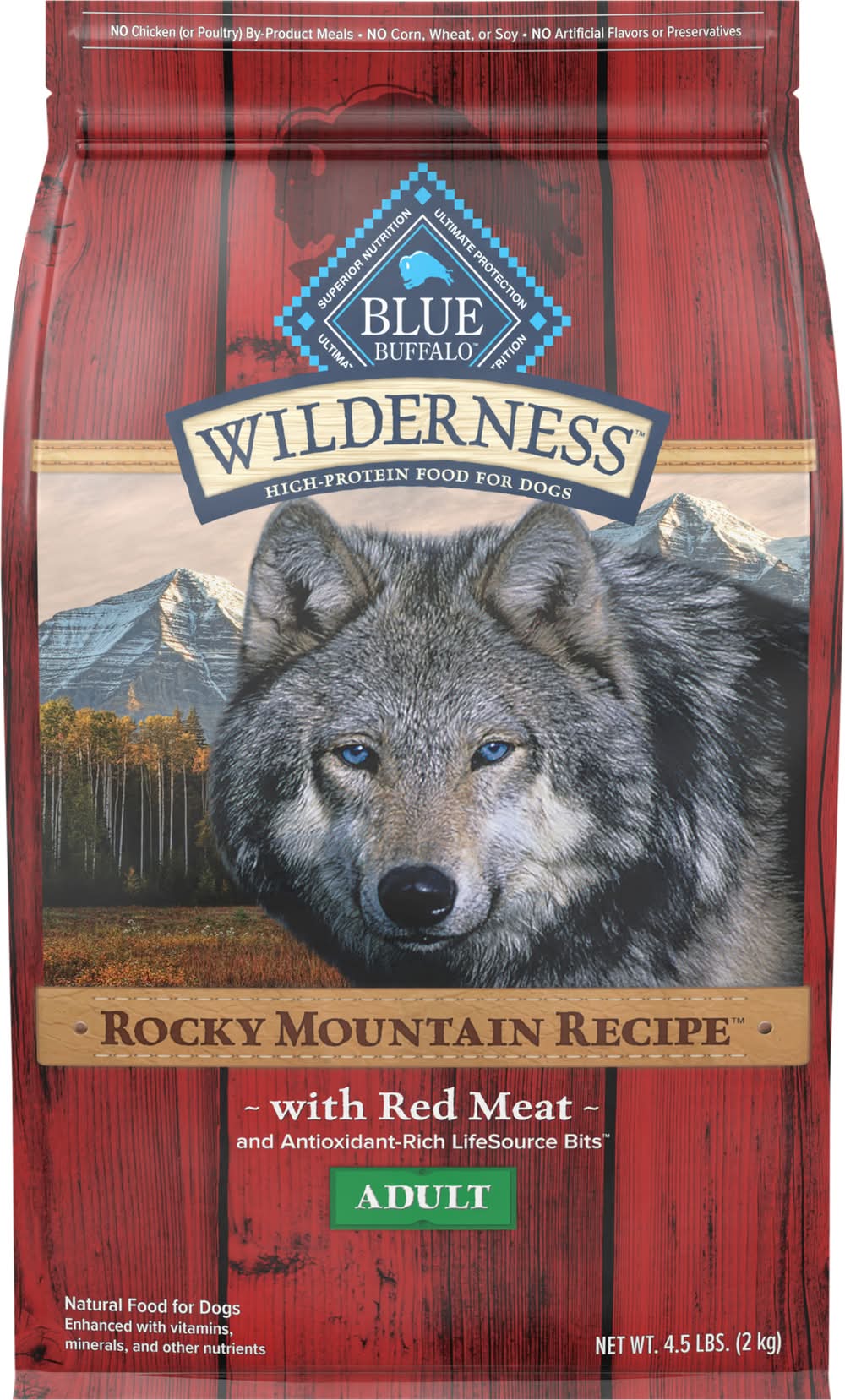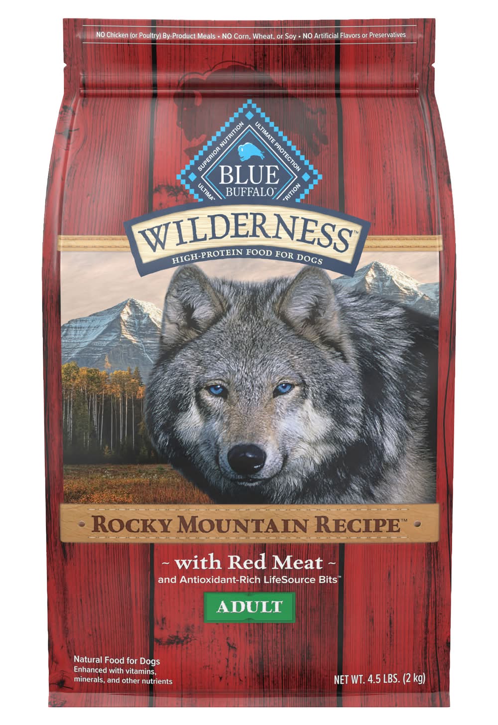 High - protein food for dogs. Rocky mountain recipe with red meat and antioxidant - rich lifesource bits. Natural food for dogs enhanced with vitamins, minerals, and other nutrients. No artificial flavors or preservatives. No chicken (or poultry) by-product meals. No corn, wheat, or soy. Superior nutrition. Ultimate protection. Rocky mountain recipe: in celebration of the spirit of the wolf and the American west, we've created Blue wilderness rocky mountain recipe. Made with hearty red meat, rocky mountain recipe will more than satisfy the instincts of the carnivore inside every dog. High-protein food for dogs rocky mountain recipe provides your dog with the delicious meat he loves, plus the complex carbohydrates he needs to thrive. Formulated by animal nutritionists, it's ideal for pet parents who want to feed a high-protein formula. High-quality protein: Deboned beef, venison, and lamb. Healthy Complex carbohydrates: Oat, barley, and brown rice. Nutritious fruits and vegetables: Carrots, blueberries, and cranberries. Antioxidant-rich lifesource bits. Blue's exclusive lifesource bits are a precise blend of antioxidants, vitamins, and minerals selected by veterinarians and animal nutritionists to help support: Immune system health. Life stage requirements. Healthy oxidative balance and lifesource bits are cold-formed to help maintain the potency of their ingredients by minimizing their exposure to heat during processing. Rocky mountain recipe adult dog formula: Healthy muscle development: High-quality protein from deboned beef, venison, and lamb, helps build and maintain strong muscles. Strong bones & teeth: A precise blend of calcium, phosphorus, and essential vitamins helps promote strong bones and teeth. Healthy skin & coat: An optimal balance of omega 3 & 6 fatty acids helps promote a shiny coat and healthy skin. Energy for an active life essential proteins and carbohydrates help meet energy requirements for a healthy lifestyle. Joint health: Glucosamine helps support joint function and overall mobility. Immune system health: Essential vitamins, chelated minerals, and important antioxidants help support the immune system. True blue promise: Formulated with the finest natural ingredients. Real beef first ingredient. No chicken (or poultry) by-product meals. No corn, wheat or soy. No artificial flavors or preservatives. BlueBuffalo.com. Introducing Buddies: Your new partner in pet parenthood. Size: 4.57 lb