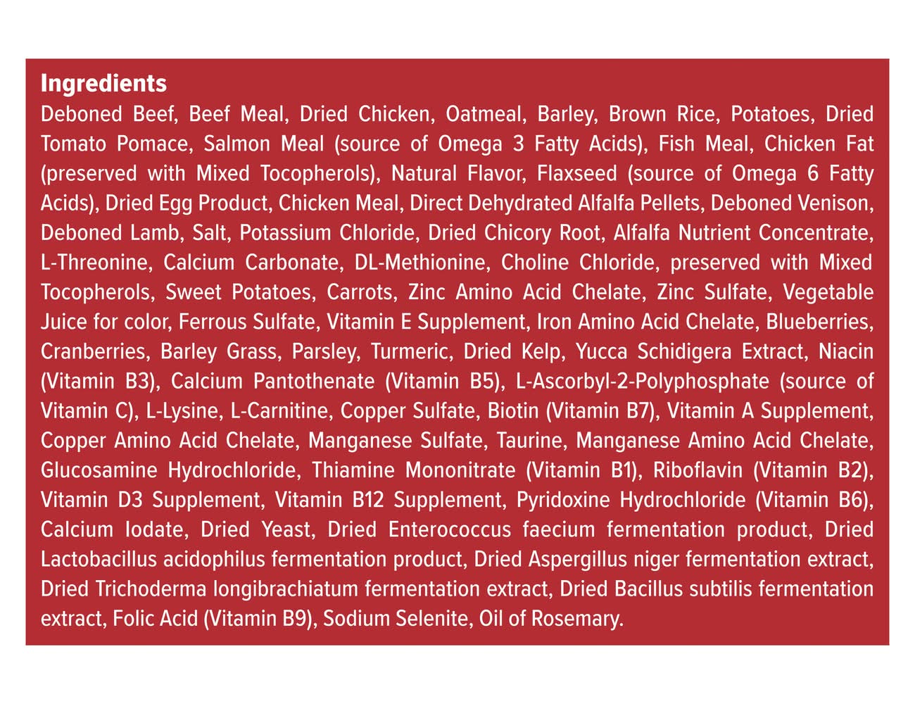 Ingredients: Deboned Beef, Beef Meal, Dried Chicken, Oatmeal, Barley, Brown Rice, Potatoes, Dried Tomato Pomace, Salmon Meal (Source of Omega 3 Fatty Acids), Fish Meal, Chicken Fat (Preserved with Mixed Tocopherols), Natural Flavor, Flaxseed (Source of Omega 6 Fatty Acids), Dried Egg Product, Chicken Meal, Direct Dehydrated Alfalfa Pellets, Deboned Venison, Deboned Lamb, Salt, Potassium Chloride, Dried Chicory Root, Alfalfa Nutrient Concentrate, L-Threonine, Calcium Carbonate, DL-Methionine, Choline Chloride, Preserved with Mixed Tocopherols, Sweet Potatoes, Carrots, Zinc Amino Acid Chelate, Zinc Sulfate, Vegetable Juice for Color, Ferrous Sulfate, Vitamin E Supplement, Iron Amino Acid Chelate, Blueberries, Cranberries, Barley Grass, Parsley, Turmeric, Dried Kelp, Yucca Schidigera Extract, Niacin (Vitamin B3), Calcium Pantothenate (Vitamin B5), L-Ascorbyl-2-Polyphosphate (Source of Vitamin C), L-Lysine, L-Carnitine, Copper Sulfate, Biotin (Vitamin B7), Vitamin A Supplement, Copper Amino Acid Chelate, Manganese Sulfate, Taurine, Manganese Amino Acid Chelate, Glucosamine Hydrochloride, Thiamine Mononitrate (Vitamin B1), Riboflavin (Vitamin B2), Vitamin D3 Supplement, Vitamin B12 Supplement, Pyridoxine Hydrochloride (Vitamin B6), Calcium Iodate, Dried Yeast, Dried Enterococcus Faecium Fermentation Product, Dried Lactobacillus Acidophilus Fermentation Product, Dried Aspergillus Niger Fermentation Extract, Dried Trichoderma Longibrachiatum Fermentation Extract, Dried Bacillus Subtilis Fermentation Extract, Folic Acid (Vitamin B9), Sodium Selenite, Oil of Rosemary Contains: Oat, Barley, Fish, Salmon, Fish, Eggs