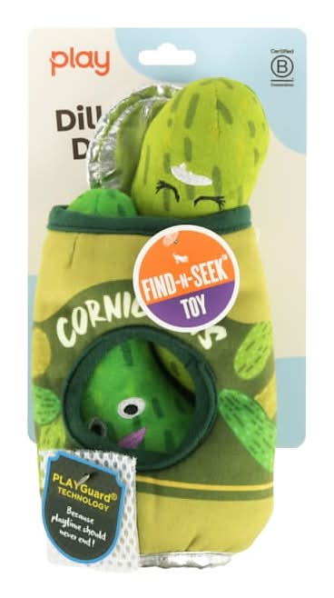 Get ready to relish playtime with the Dill-icious Delights dog toy! This pickle jar features two squeaky, crinkly pickles that pop out for interactive fun and can even hide treats inside for extra enrichment. Whether your pup is tugging, snuggling or sniffing out a snack, this toy is sure to tickle their taste for play. Size: 0.24 lb