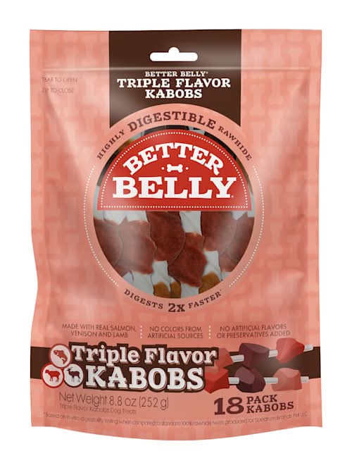 Reward your pup with a treat unlike any other! Standard rawhide is made of fibers that link together, making the hide tough but flexible. Our proprietary manufacturing process helps break down the rawhide fibers, so Better Belly Kabobs digest two times faster than standard rawhide. Easier digestibility plus long-lasting chew time-that's a win-win for you and your pup. Made with real salmon, venison and lamb, you dog is sure to love the delicious flavors and fun kabob shape! Even better, these chews have no gluten added, no artificial flavors or preservatives added and no colors from artificial sources so you can feel good about treating your furry friend to a Better Belly Kabob chew. Size: 0.69 lb