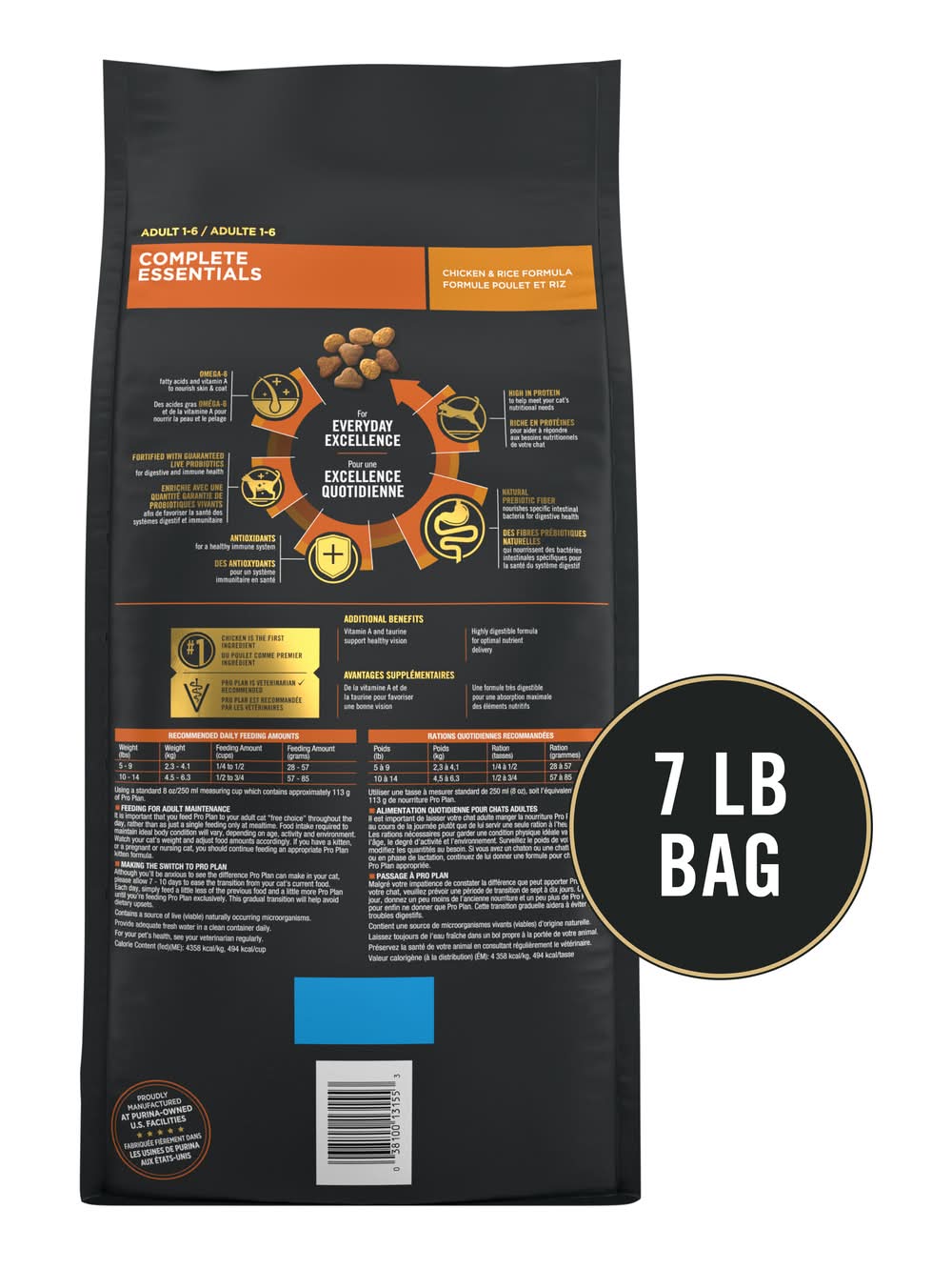 Pique your cat's interests and delight her taste buds when you fill her dish with Purina Pro Plan COMPLETE ESSENTIALS Chicken & Rice Formula adult dry cat food at mealtime. Our chicken and rice cat food formula is made with high-quality protein, including chicken as the first ingredient, and contains guaranteed live probiotics to support digestive and immune health. This high-protein dry cat food includes 36 percent protein to help meet a cat's unique nutritional needs, and every high-quality ingredient is carefully chosen for a specific purpose. Vitamin A and linoleic acid, an omega-6 fatty acid, help to support her healthy skin and coat, while antioxidants support immune system health, and prebiotic fiber promotes good digestion. A combination of delicious taste and tempting texture comes together for a sensory experience cats can't resist. Give her the nutrition she needs when you make Purina Pro Plan COMPLETE ESSENTIALS adult cat food with probiotics part of her regular menu. Size: 7.30 lb
