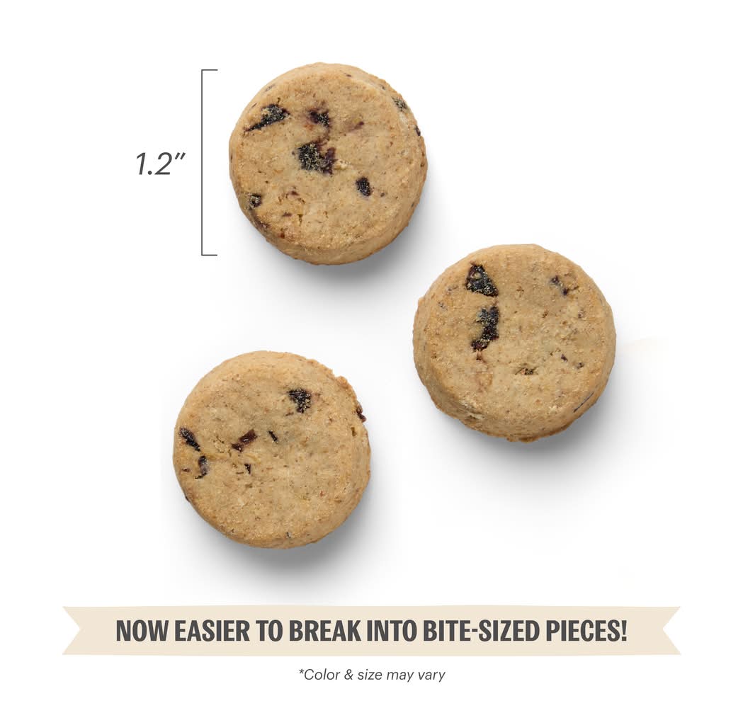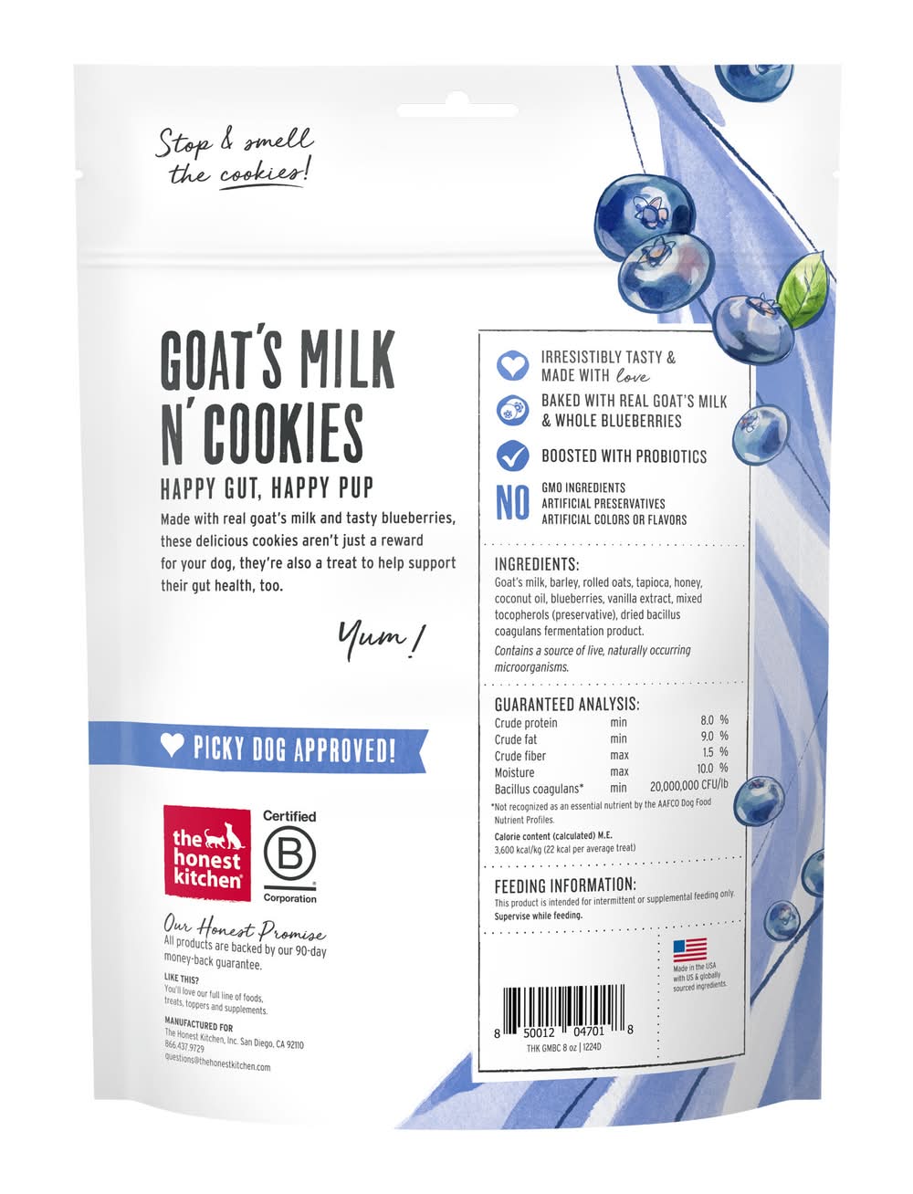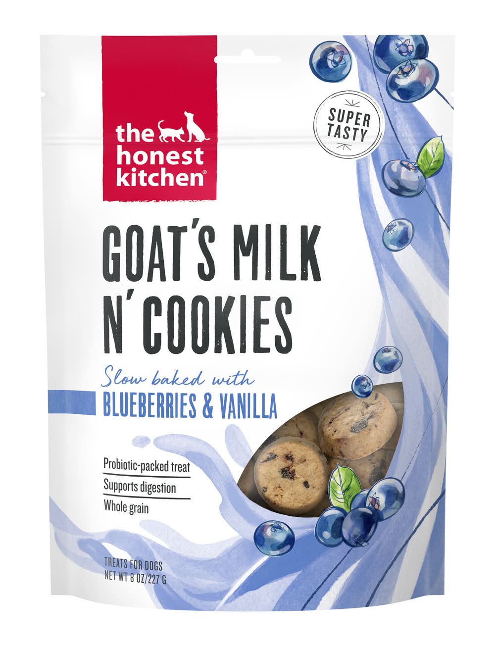 Crunchy Probiotic Snacks. Small Batch - Super Tasty. Stop & Smell the Cookies. Slow Baked with Blueberries & Vanilla. Picky Dog Approved. Savory Protein Cookies. Packed with Probiotics. Whole Grain, Wheat Free. Juicy Blueberries & Real Goat's Milk. Natural Treats for Dogs. Non-GMO. Happy Gut Happy Pup. We believe that good dogs shouldn't settle for boring biscuits! With each bite of our Goats Milk N' Cookies, your pup gets a delicious dip of rich goats milk, juicy blueberries and a touch of sweet vanilla. Each little cookie is slow baked in small batches and full of probiotics to support a happy belly. Flavor meets function in every bite. Irresistibly Tasty & Made with Love. Baked with Real Blueberries & Vanilla. Boosted with Probiotics. No GMO Ingredients, Artificial Preservatives, Artificial Colors or Flavors. Size: 0.60 lb