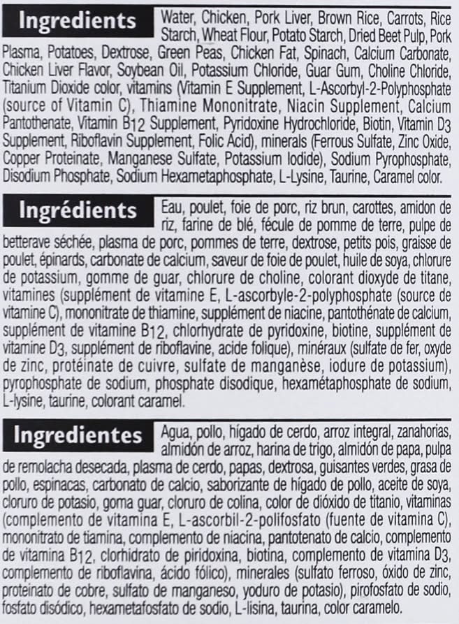 Ingredients: Water, Chicken, Pork Liver, Brown Rice, Carrots, Rice Starch, Wheat Flour, Potato Starch, Dried Beet Pulp, Pork Plasma, Potatoes, Dextrose, Green Peas, Spinach, Calcium Carbonate, Chicken Liver Flavor, Soybean Oil, Potassium Chloride, Guar Gum, Choline Chloride, Titanium Dioxide Color, Vitamins (Vitamin E Supplement, Thiamine Mononitrate, Niacin Supplement, Calcium Pantothenate, Vitamin B12 Supplement, Pyridoxine Hydrochloride, Biotin, Vitamin D3 Supplement, Riboflavin Supplement, Folic Acid), Minerals (Ferrous Sulfate, Zinc Oxide, Copper Proteinate, Manganese Sulfate, Potassium Iodide), Sodium Pyrophosphate, Disodium, Sodium Hexametaphosphate, L-Carnitine, L-Lysine, Taurine, Caramel Color