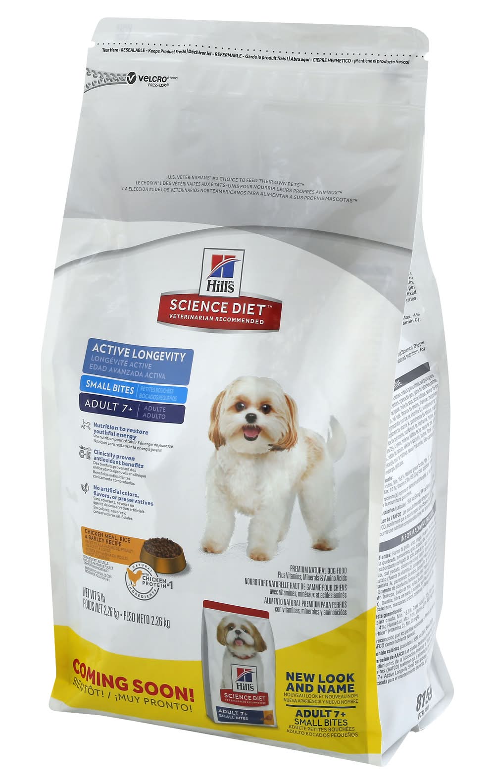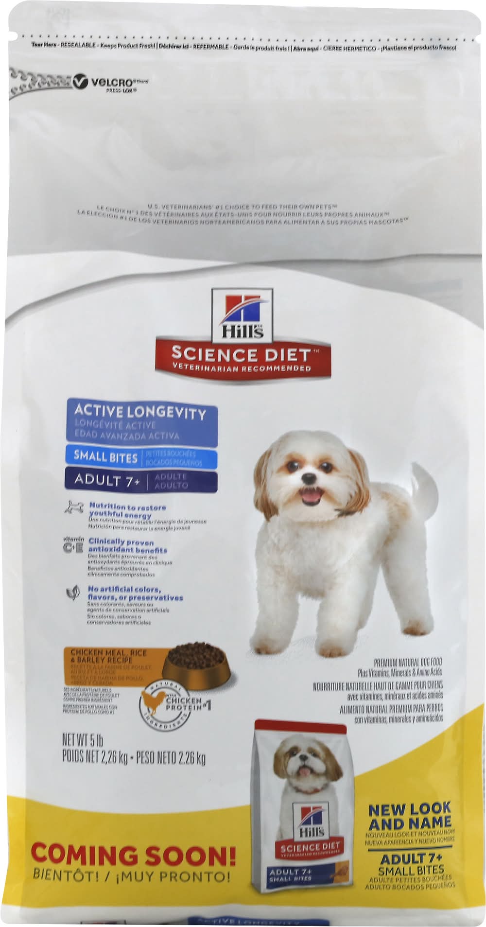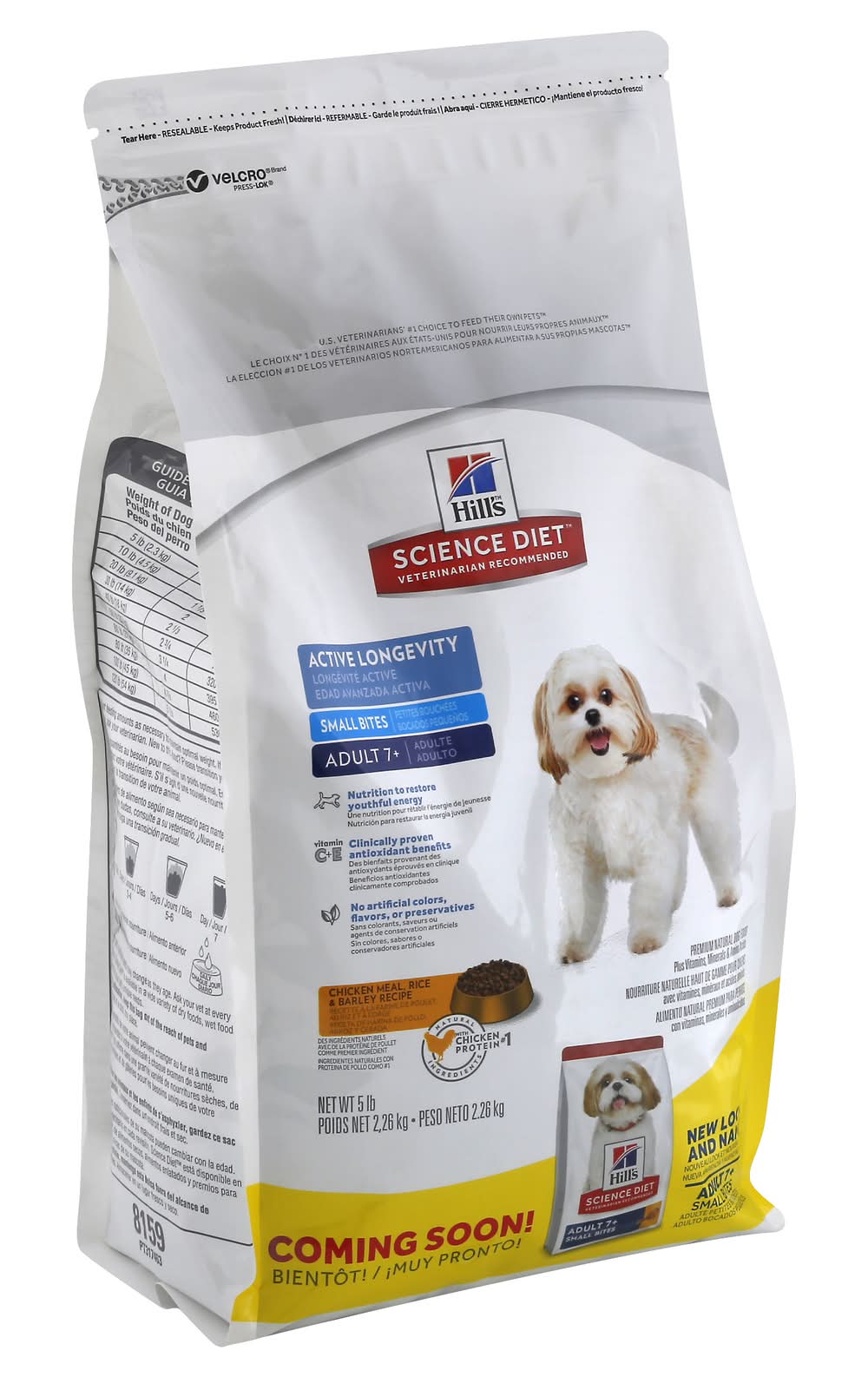 Premium natural dog food. No artificial colors, flavors, or preservatives. With chicken protein No. 1. Veterinarian recommended. Nutrition to restore youthful energy. Vitamin C+E: Clinically proven antioxidant benefits. Great tasting natural nutrition for a long, happy life. With a wagging tail and licks on your face, no one can say hello like your dog. Because every moment you spend together is special, we strive to give you more of them. With natural ingredients and the right nutrients, Hill's Science Diet is precisely prepared to offer your dog the nutrition he needs for lifelong health and happiness. Highly digestible, high quality protein to help maintain lean muscle. High quality fiber, fatty acids and antioxidants to support healthy digestion, skin & coat and a strong immune system. Donut, adopted from Wayside Waifs, Kansas City. Clinically proven antioxidant blend with vitamins C + E to help support a healthy immune system. A synergistic combination of key nutrients promotes youthful vitality. Natural, high quality, easy-to-digest ingredients with no artificial colors, flavors or preservatives for a flavorful, nutritious meal. US vets' No. 1 choice for their own pets. Resealable - keeps product fresh! Velcro Brand. Press-Lok. 100% satisfaction guarantee. You can make a difference in the lives of shelter pets. With every purchase of Science Diet you help feed over 100,000 homeless pets everyday, 365 days a year. Coming soon! Hill's Science Diet adult 7+ small bites. Science Diet is available in a wide variety of dry foods, wet foods and treats for your pet's unique needs. Made in USA with global ingredients you can trust. Made in the USA with US and imported ingredients. Size: 5.41 lb