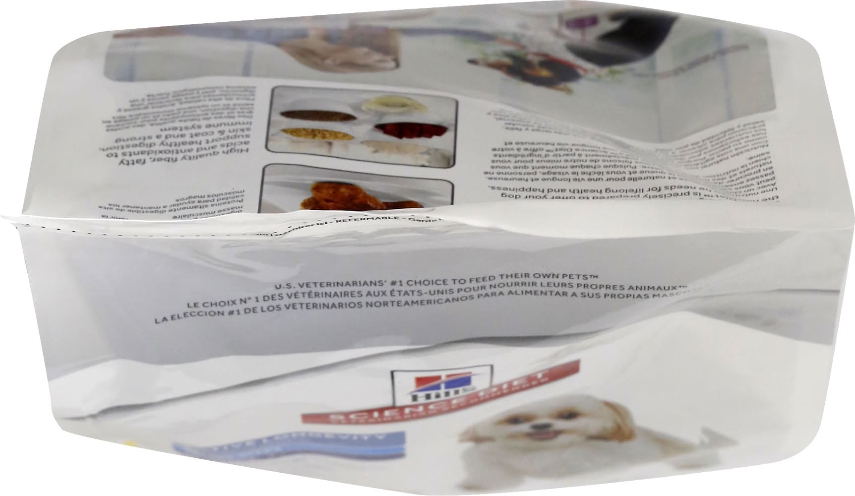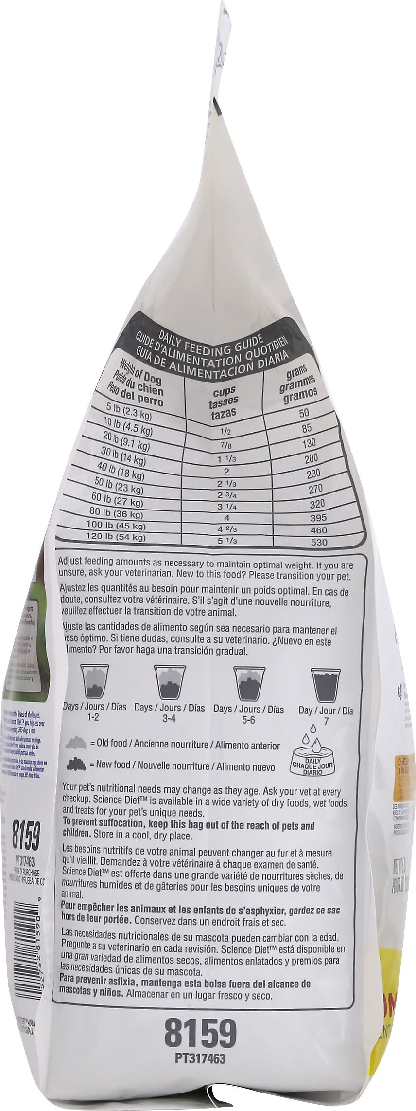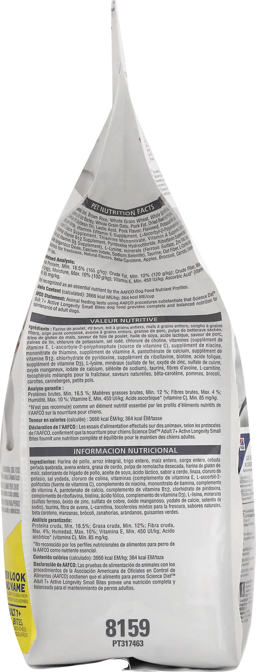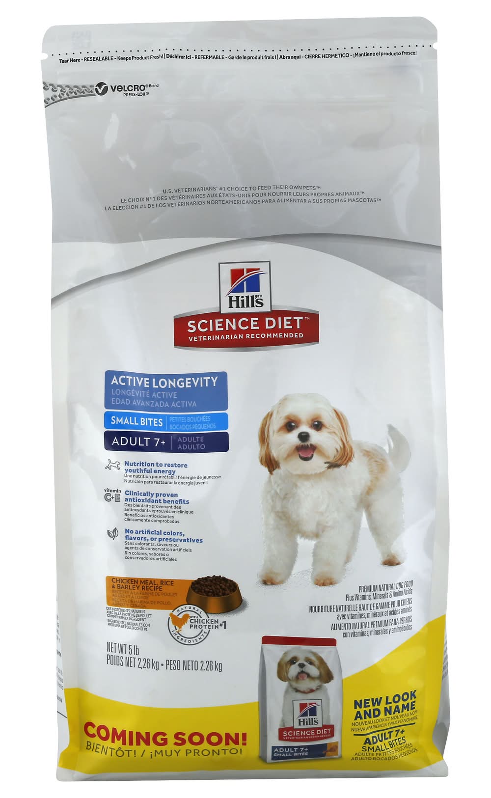 Premium natural dog food. No artificial colors, flavors, or preservatives. With chicken protein No. 1. Veterinarian recommended. Nutrition to restore youthful energy. Vitamin C+E: Clinically proven antioxidant benefits. Great tasting natural nutrition for a long, happy life. With a wagging tail and licks on your face, no one can say hello like your dog. Because every moment you spend together is special, we strive to give you more of them. With natural ingredients and the right nutrients, Hill's Science Diet is precisely prepared to offer your dog the nutrition he needs for lifelong health and happiness. Highly digestible, high quality protein to help maintain lean muscle. High quality fiber, fatty acids and antioxidants to support healthy digestion, skin & coat and a strong immune system. Donut, adopted from Wayside Waifs, Kansas City. Clinically proven antioxidant blend with vitamins C + E to help support a healthy immune system. A synergistic combination of key nutrients promotes youthful vitality. Natural, high quality, easy-to-digest ingredients with no artificial colors, flavors or preservatives for a flavorful, nutritious meal. US vets' No. 1 choice for their own pets. Resealable - keeps product fresh! Velcro Brand. Press-Lok. 100% satisfaction guarantee. You can make a difference in the lives of shelter pets. With every purchase of Science Diet you help feed over 100,000 homeless pets everyday, 365 days a year. Coming soon! Hill's Science Diet adult 7+ small bites. Science Diet is available in a wide variety of dry foods, wet foods and treats for your pet's unique needs. Made in USA with global ingredients you can trust. Made in the USA with US and imported ingredients. Size: 5.41 lb
