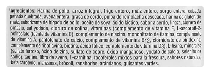 Ingredients: Chicken Meat, Brown Rice, Whole Grain Wheat, Whole Grain Corn, Whole Grain Sorghum, Cracked Pearled Barley, Whole Grain Oats, Pork Fat, Dried Beet Pulp, Corn Gluten Meal, Chicken Liver Flavor, Soybean Oil, Lactic Acid, Pork Flavor, Flaxseed, Potassium Chloride, Iodized Salt, Choline Chloride, Vitamins (Vitamin E Supplement, L-Ascorbyl-2-Polyphosphate (Source of Vitamin C), Niacin Supplement, Thiamine Mononitrate, Vitamin A Supplement, Calcium Pantothenate, Vitamin B12 Supplement, Pyridoxine Hydrochloride, Riboflavin Supplement, Biotin, Folic Acid, Vitamin D3 Supplement), L-Lysine, Minerals (Ferrous Sulfate, Zinc Oxide, Copper Sulfate, Manganous Oxide, Calcium Iodate, Sodium Selenite), Taurine, Oat Fiber, L-Carnitine, Mixed Tocopherols for Freshness, Natural Flavors, Beta-Carotene, Apples, Broccoli, Carrots, Cranberries, Green Peas
