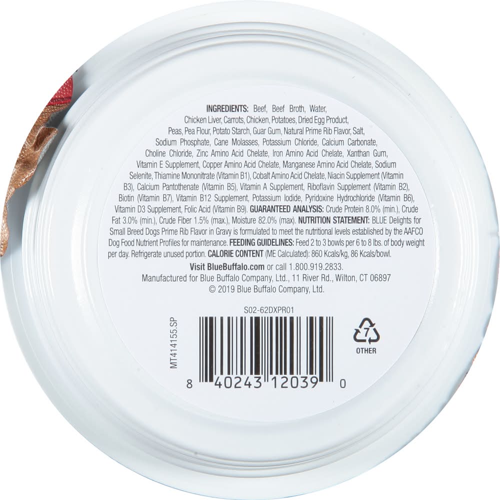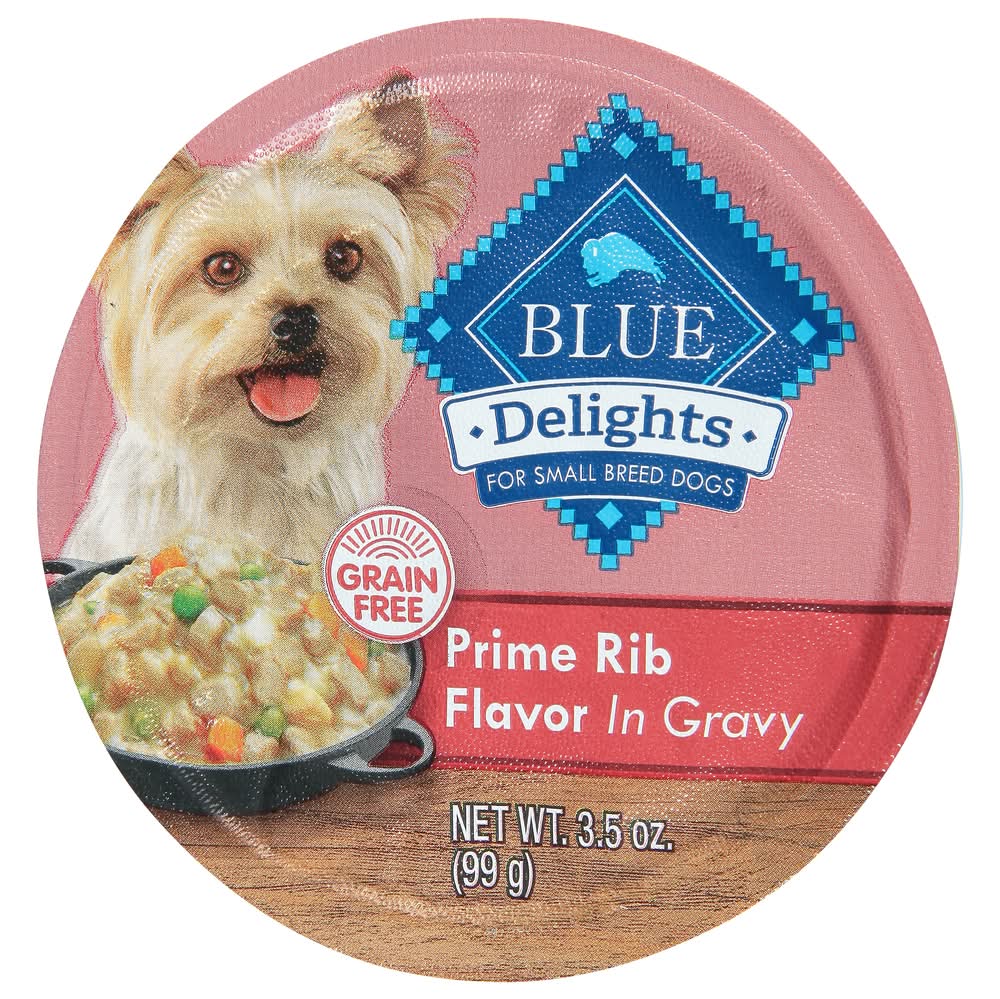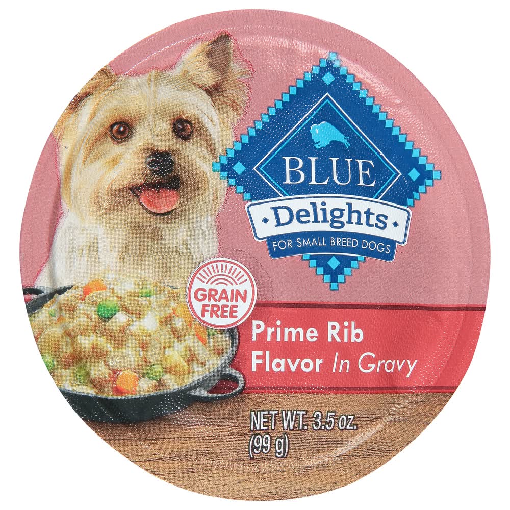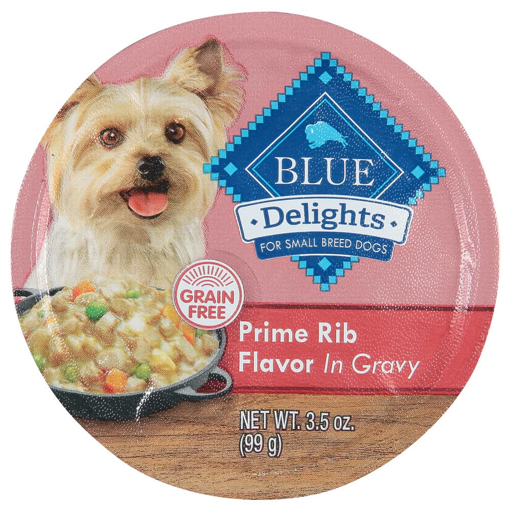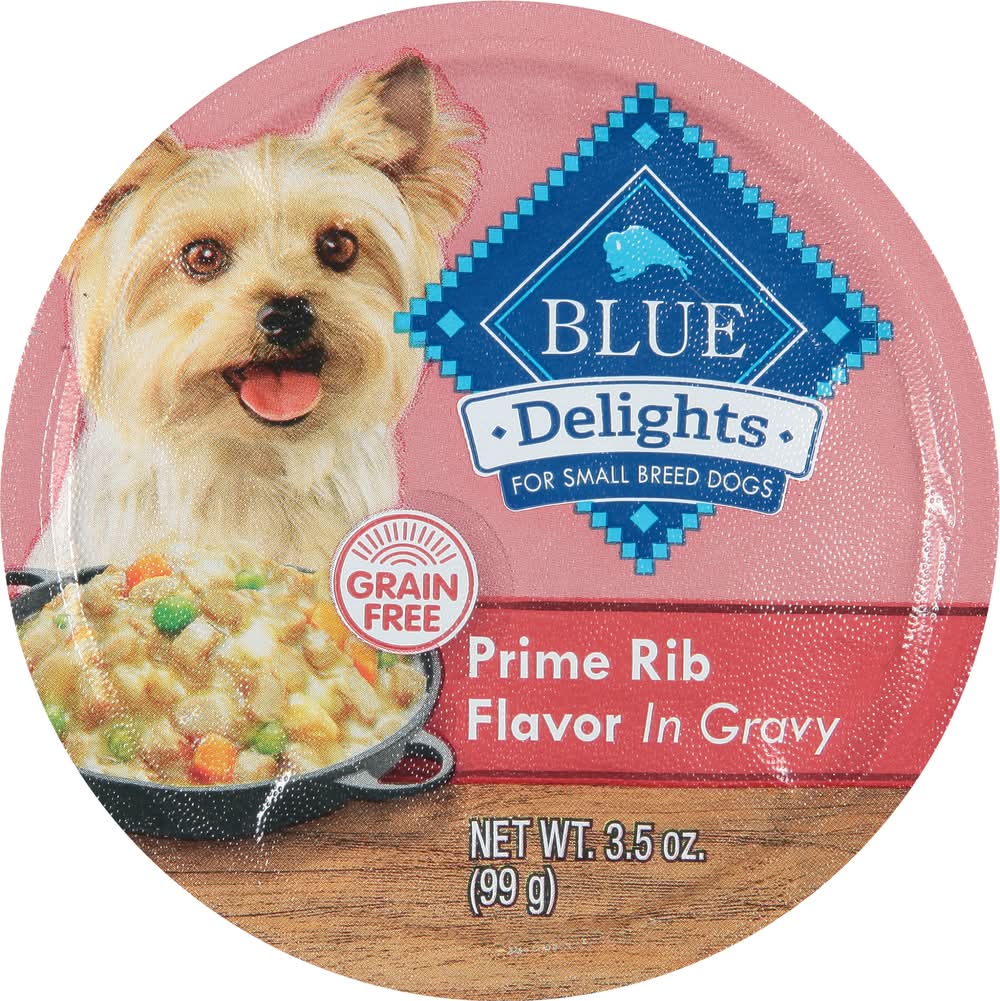 Satisfy your dog's craving for real beef with BLUE Divine Delights Small Breed Natural Wet Dog Food, Prime Rib Flavor in Hearty Gravy. This grain-free wet dog food contains more of the ingredients they love, including diced potatoes, diced carrots, and whole peas. And like all Blue Buffalo recipes, these single-serve trays are formulated without any chicken (or poultry) by-product meals. They are also free of corn, wheat, soy, artificial flavors, and preservatives. Feed your small pup 2-3 bowls per day per 6 to 8 lbs. of body weight, and be sure to refrigerate any unused portion. • Size: 0.26 lb • Packaging: Reusable