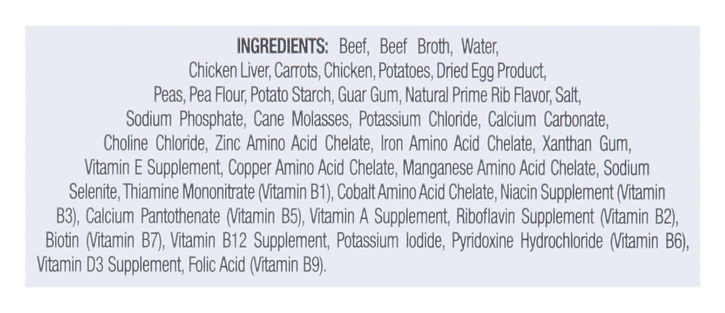 Ingredients: Beef, Beef Broth, Water, Chicken Liver, Carrots, Chicken, Potatoes, Dried Egg Product, Peas, Pea Flour, Potato Starch, Guar Gum, Natural Prime Rib Flavor, Salt, Sodium Phosphate, Cane Molasses, Potassium Chloride, Calcium Carbonate, Choline Chloride, Zinc Amino Acid Chelate, Iron Amino Acid Chelate, Xanthan Gum, Vitamin E Supplement, Copper Amino Acid Chelate, Manganese Amino Acid Chelate, Sodium Selenite, Thiamine Mononitrate (Vitamin B1), Cobalt Amino Acid Chelate, Niacin Supplement (Vitamin B3), Calcium Pantothenate (Vitamin B5), Vitamin A Supplement, Riboflavin Supplement (Vitamin B2), Biotin (Vitamin B7), Vitamin B12 Supplement, Potassium Iodide, Pyridoxine Hydrochloride (Vitamin B6), Vitamin D3 Supplement, Folic Acid (Vitamin B9) Contains: Eggs