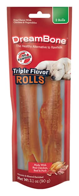 DreamBone chews have all the benefits of a rawhide chew without the rawhide. These no-rawhide DreamBone Triple Flavor Rolls are made with real chicken, beef and pork for a scrumptious taste your dog can't resist! Made with real chicken, beef and pork and vitamin and mineral enriched, DreamBone Triple Flavor Rolls are a healthy alternative to rawhide with an irresistible taste dogs dream about. Treat your pup to these easy-to-digest and 100 percent delicious chews. Chewing helps maintain healthy teeth. Contains 6 chews. Size: 0.29 lb