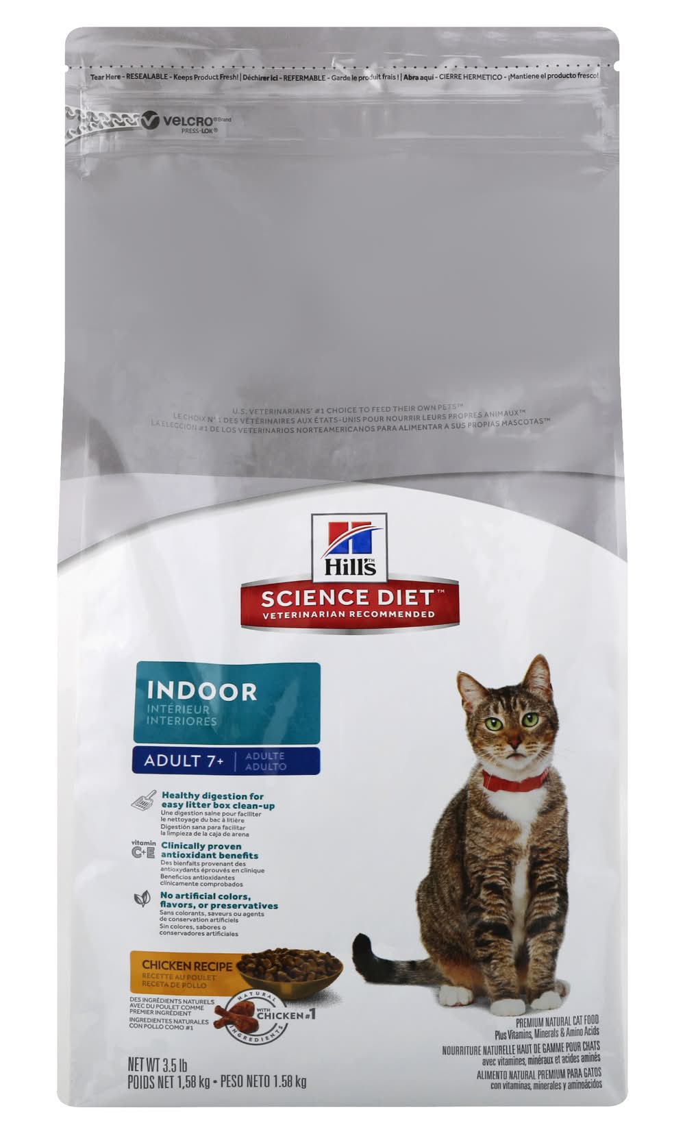 Plus vitamins, minerals & amino acids. Veterinarian recommended. Healthy digestion for easy litter box clean-up. Clinically proven antioxidant benefits. No artificial colors, flavors, or preservatives. With chicken no. 1 natural ingredient. U.S. Veterinarians' no. 1 choice to feed their own pets. Great tasting natural nutrition for a long, happy life. With soft purrs and even softer nuzzles, you and your cat have a thing all your own. Because every moment you spend together is special, we strive to give you more of them. WIth natural ingredients and the right nutrients. Hill's Science Diet is precisely prepared to offer your cat then nutrition she needs for lifelong health and happiness. Highly digestible, high quality protein to help maintain lean muscle. High quality fiber, fatty acids and antioxidants to support healthy digestion, skin & coat and a strong immune system. Natural fiber comfortably reduces hairballs. Healthy fiber supports digestive health and high quality ingredients make litter box clean-up easy. Clinically proven antioxidant blend with vitamins C + E to help support a healthy immune system. Natural, high quality, easy-to-digest ingredients with no artificial colors, flavors or preservatives for a flavorful, nutritious meal. Luna, Adopted from Wayside Waifs, Kansas City. US Vets' no. 1 choice for their own pets. for Adult 7+ cats Size: 3.91 lb