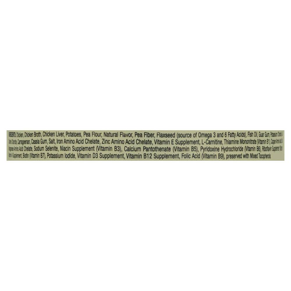 Ingredients: Chicken, Chicken Broth, Chicken Liver, Potatoes, Pea Flour, Natural Flavor, Pea Fiber, Flaxseed (Source of Omega 3 and 6 Fatty Acids), Fish Oil, Guar Gum, Potassium Chloride, Taurine, Choline Chloride, Carrageenan, Cassia Gum, Salt, Iron Amino Acid Chelate, Zinc Amino Acid Chelate, Vitamin E Supplement, L-Carnitine, Thiamine Mononitrate (Vitamin B1), Copper Amino Acid Chelate, Manganese Amino Acid Chelate, Sodium Selenite, Niacin Supplement (Vitamin B3), Calcium Pantothenate (Vitamin B5), Pyridoxine Hydrochloride (Vitamin B6), Riboflavin Supplement (Vitamin B2), Vitamin A Supplement, Biotin (Vitamin B7), Potassium Iodide, Vitamin D3 Supplement, Vitamin B12 Supplement, Folic Acid (Vitamin B9), Preserved with Mixed Tocopherols Contains: Fish