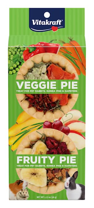The Vitakraft Fruit & Veggie Pie is made for pet rabbits, guinea pigs, and hamsters. This delicious snack provides high-fiber hay and nutritious dried fruits & vegetables; all in a premium bakery crust that is ideal for nibbling. • Size: 1.27 lb • Vitakraft Sun Seed, Inc., PO Box 33, Bowling Green, OH 43402