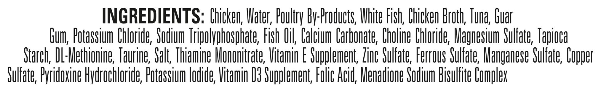 Ingredients: Chicken, Water, Poultry By-Products, White Fish, Chicken Broth, Tuna, Guar Gum, Potassium Chloride, Sodium Tripolyphosphate, Fish Oil, Calcium Carbonate, Choline Chloride, Magnesium Sulfate, Tapioca Starch, DL-Methionine, Taurine, Salt, Thiamine Mononitrate, Vitamin E Supplement, Zinc Sulfate, Ferrous Sulfate, Manganese Sulfate, Copper Sulfate, Pyridoxine Hydrochloride, Potassium Iodide, Vitamin D3 Supplement, Folic Acid, Menadione Sodium Bisulfite Complex Contains: Fish, Fish, Tuna, Sulfites
