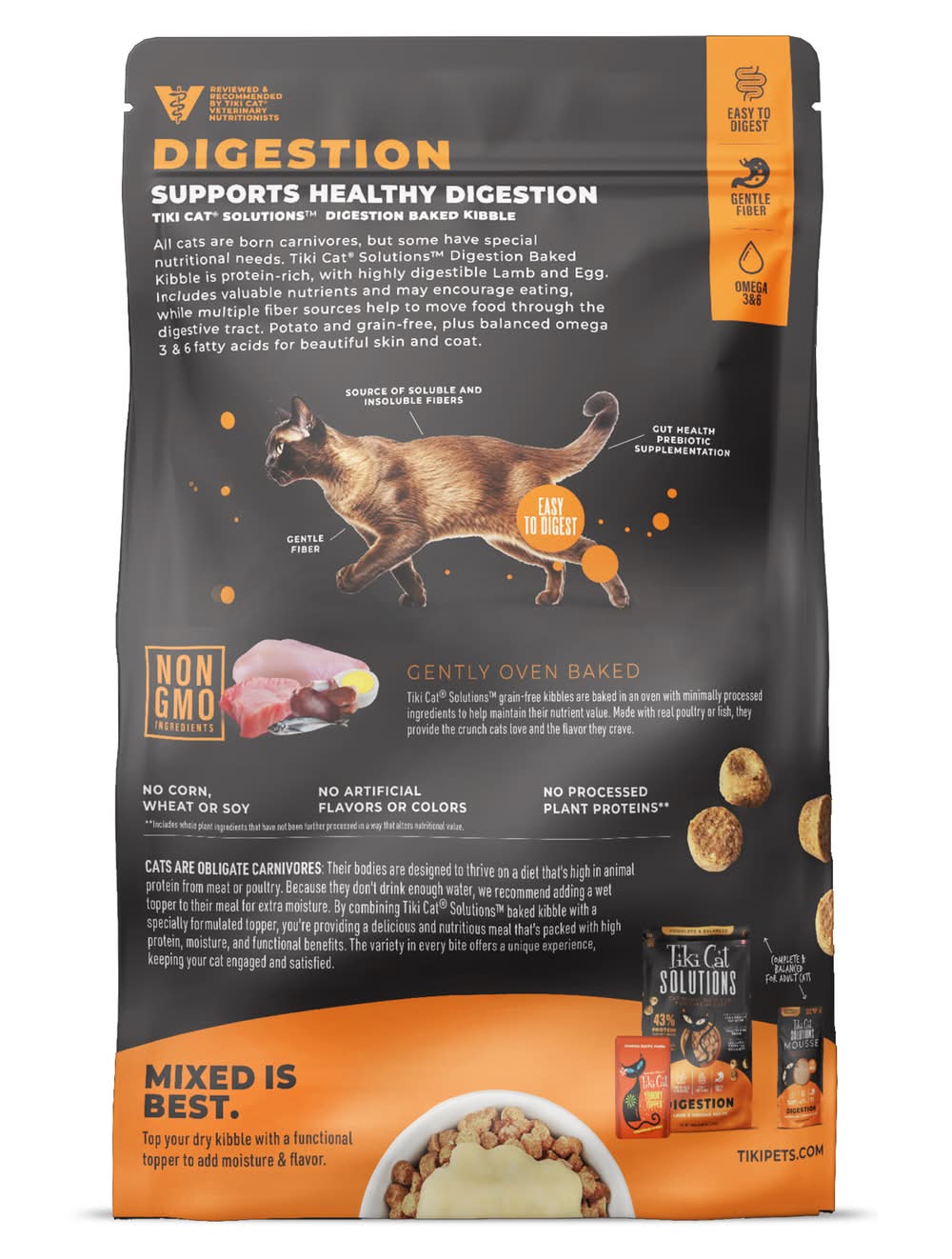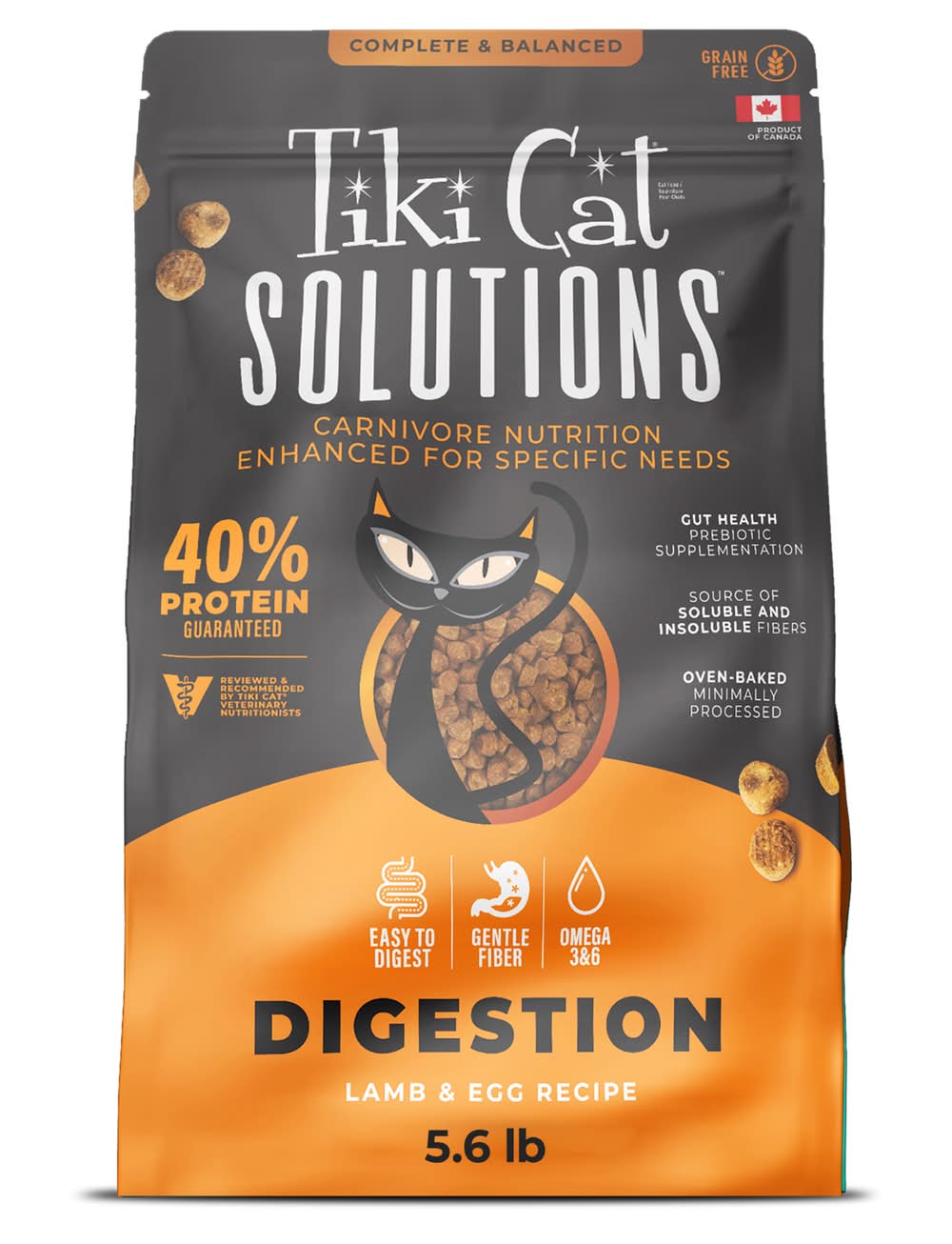 SUPPORTS HEALTHY DIGESTION. All cats are born carnivores, but some have special nutritional needs. Tiki Cat Solutions Digestion Baked Kibble is protein-rich, with highly digestible Lamb and Egg. Includes valuable nutrients and may encourage eating, while multiple fiber sources help to move food through the digestive tract. Potato and grain-free, plus balanced omega 3 & 6 fatty acids for beautiful skin and coat. Size: 5.60 lb
