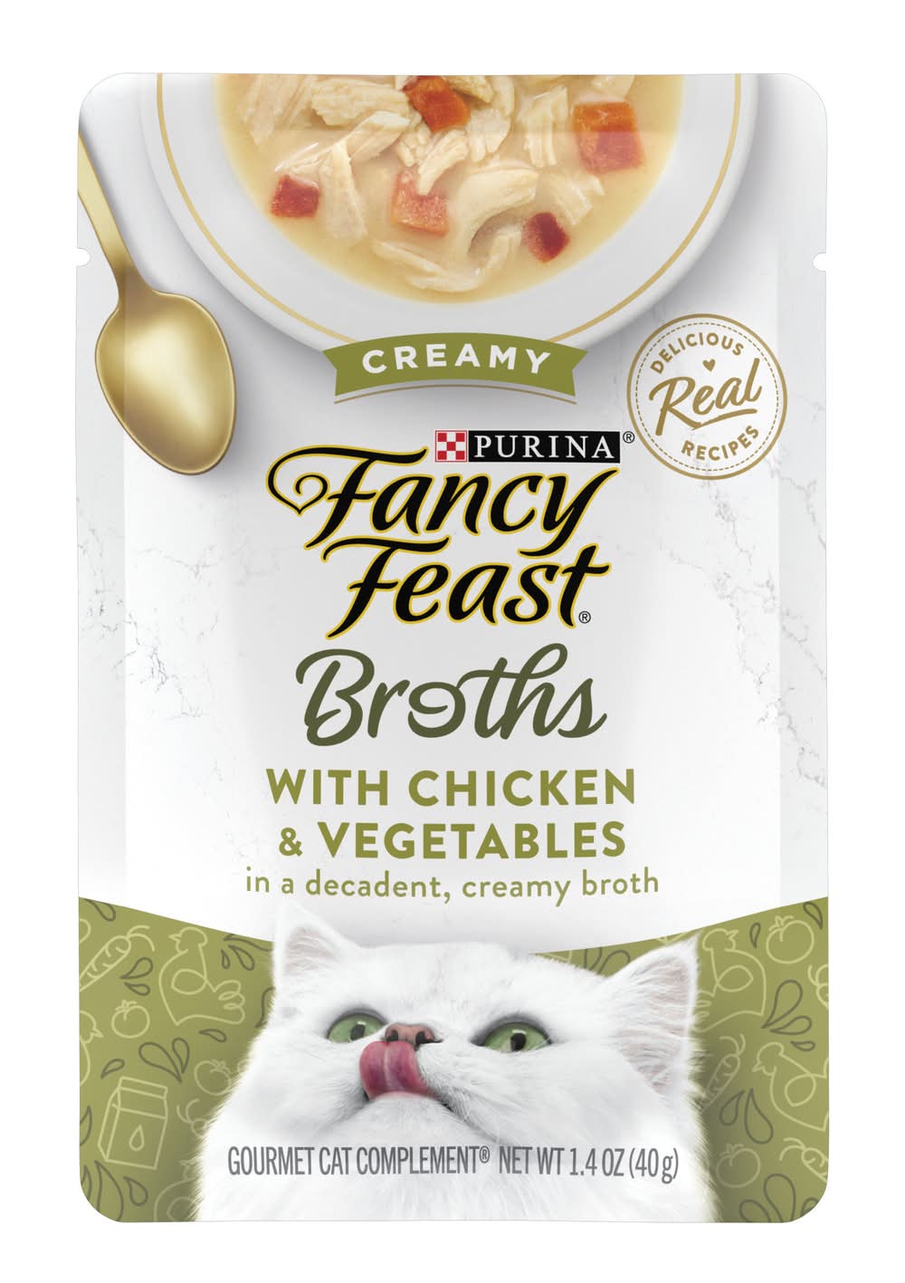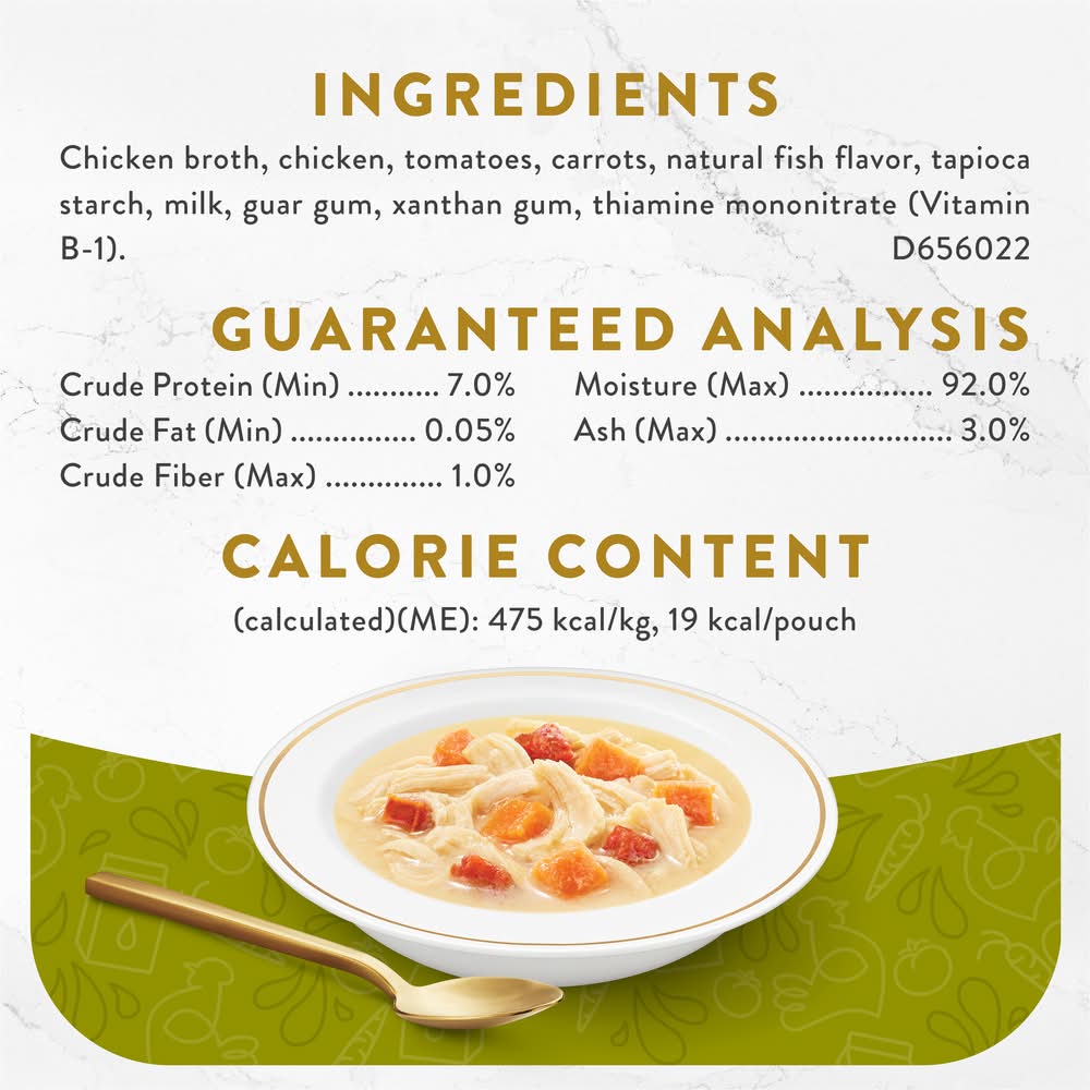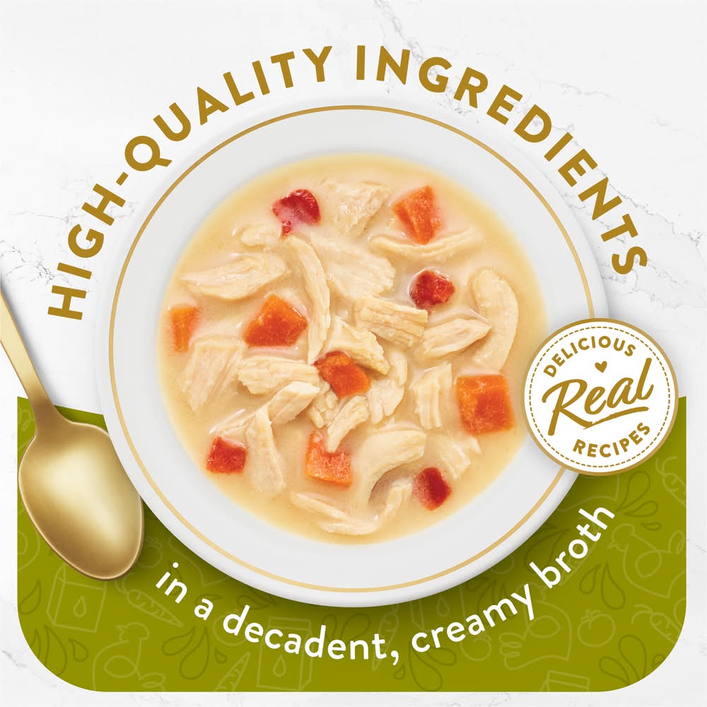 Create a gourmet dining experience for your cat with a Purina Fancy Feast Broths Creamy With Chicken and Vegetables Gourmet lickable adult cat food topper complement. Morsels of real chicken and vegetables combine in this grain free wet cat food mixer to offer the delicate flavors cats love, and the decadent, silky broth for cats will have her lapping up every last mouthwatering drop. We make our cat food toppers with real, recognizable ingredients you can see and no artificial flavors, colors or preservatives, so you can feel good about offering them to your feline friend. With the unmistakable taste and tender texture your cat craves, this simply crafted premium liquid cat food broth recipe is a true feast for her senses. Serve a pouch of this delectable gourmet grain free cat food topping daily as an addition to her complete and balanced adult cat food diet, and watch as she delights in the lickable, savory broth and delectable ingredients found in every bite. • Size: 0.13 lb • Nestle Purina PetCare Company, St Louis, MO, 63164.