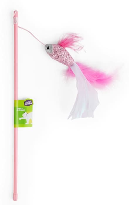 Encourage exercise and promote healthy play with the Fish Cat Teaser Toy from Leaps & Bounds. This 18" stick features a 14" string with an adorable plush toy and feathers that your cat will love playing with. • Color: Blue • Size: Large