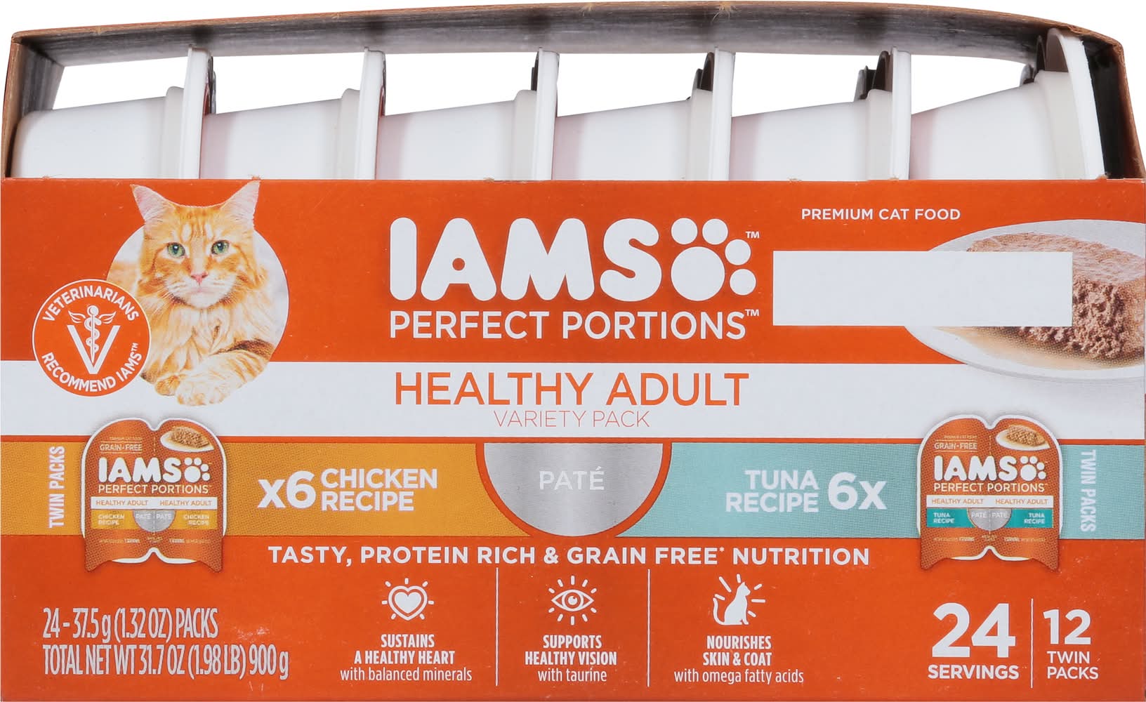 Your cat is unique that's why IAMS makes a cat food that's just as unique as they are. IAMS PERFECT PORTIONS Healthy Adult Grain Free* Wet Cat Food Pate Variety Pack was created to support your cat's health and well-being. Forget messy leftovers from canned cat food. This variety pack of easy peel twin pack meals contains both chicken recipes and tuna recipes and is made in the USA with the world's finest ingredients, 0% fillers, and no artificial preservatives.* The grain-free* soft cat food provides complete and balanced nutrition at every stage of life. Plus, this tasty pate supports your cat's immune system with antioxidant Vitamin E for a lifetime of health and fun. When you feed your cat veterinarian-recommended IAMS, you can feel good knowing they're getting the nutrition they need to bring out their unique best. *Trace amounts may be present due to cross contact during manufacturing. • Pack size: 24 • Size: 2.68 lb