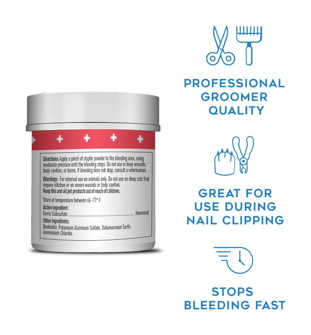 Remedy + Recovery Professional Groomer's Styptic Powder is designed to provide a safe and effective solution to halt bleeding from minor cuts, scratches, or nail clipping. It acts quickly to assist in the control of bleeding. Size: 0.15 lb