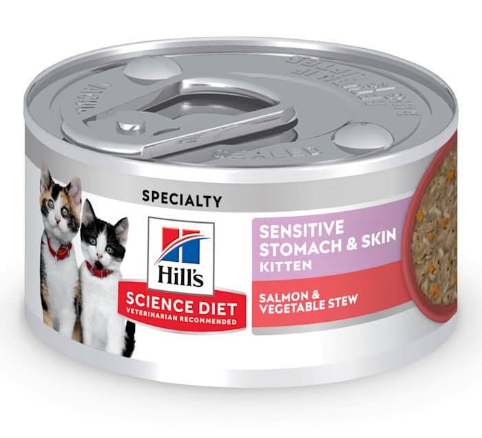 Hill's Science Diet Sensitive Stomach & Sensitive Skin wet kitten food is highly digestible for optimal nutrient absorption & easy stool pick-up. High-quality protein for building lean muscles Highly digestible food that is gentle on the stomach. Size: 0.21 lb