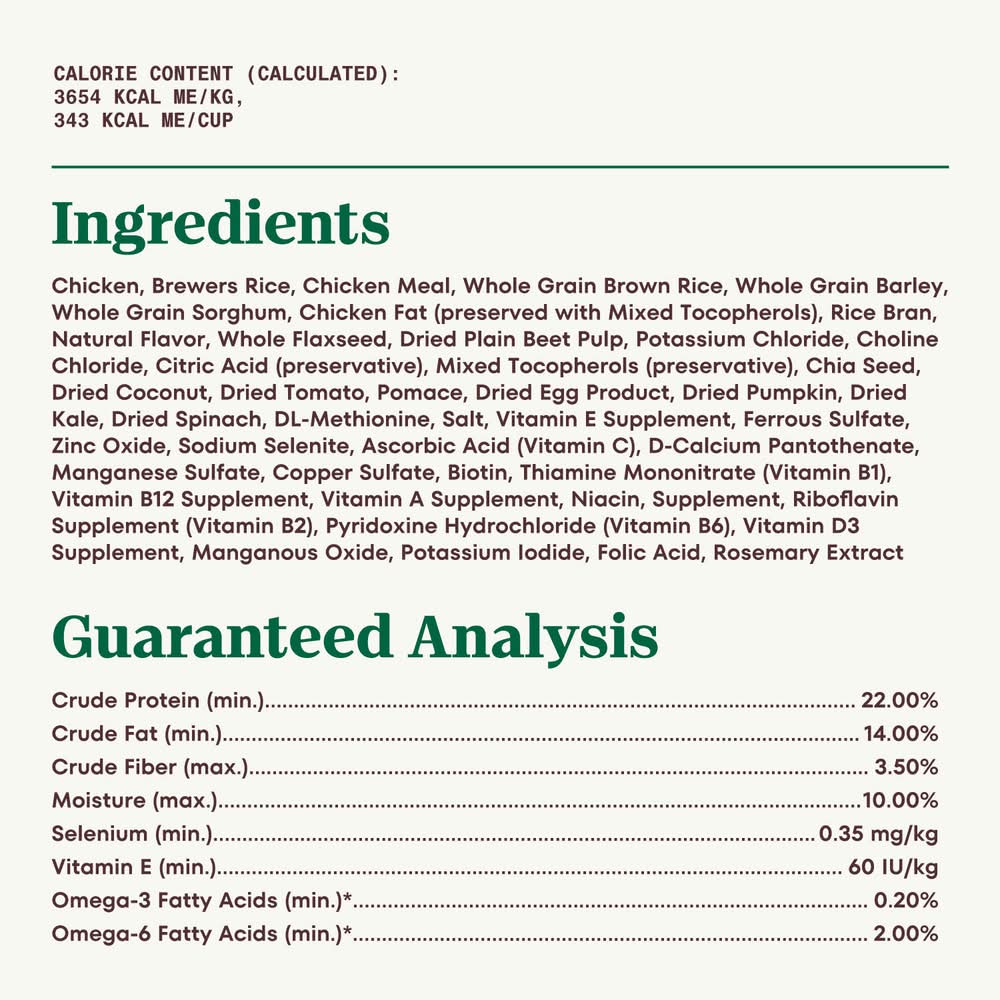 Ingredients: Chicken, Brewers Rice, Chicken Meal, Whole Grain Brown Rice, Whole Grain Barley, Whole Grain Sorghum, Chicken Fat (preserved with Mixed Tocopherols), Rice Bran, Natural Flavor, Whole Flaxseed, Dried Plain Beet Pulp, Potassium Chloride, Choline Chloride, Citric Acid (preservative), Mixed Tocopherols (preservative), Chia Seed, Dried Coconut, Dried Tomato Pomace, Dried Egg Product, Dried Pumpkin, Dried Kale, Dried Spinach, DL-Methionine, Salt, Vitamin E Supplement, Ferrous Sulfate, Zinc Oxide, Sodium Selenite, Ascorbic Acid (Vitamin C), D-Calcium Pantothenate, Manganese Sulfate, Copper Sulfate, Biotin, Thiamine Mononitrate (Vitamin B1), Vitamin B12 Supplement, Vitamin A Supplement, Niacin Supplement, Riboflavin Supplement (Vitamin B2), Pyridoxine Hydrochloride (Vitamin B6), Vitamin D3 Supplement, Manganous Oxide, Potassium Iodide, Folic Acid, Rosemary Extract