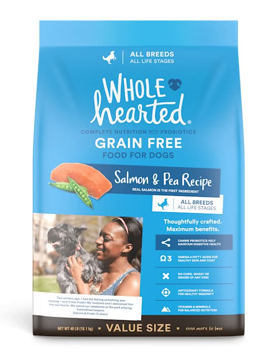 The WholeHearted Grain Free All Life Stages Salmon and Pea Recipe Dry Dog Food satisfies your pup with scrumptious flavors while providing them complete, balanced nutrition. Fill your pet's bowl with Omega-3 fatty acids, canine probiotics, antioxidants, and absolutely zero corn, wheat, or grains. Size: 40.00 lb