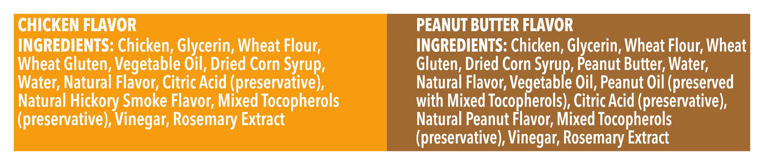 Ingredients: Chicken Flavor: Chicken, Glycerin, Wheat Flour, Wheat Gluten, Vegetable Oil, Dried Corn Syrup, Water, Natural Flavor, Citric Acid (Preservative), Natural Hickory Smoke Flavor, Mixed Tocopherols (Preservative), Vinegar, Rosemary Extract. Peanut Butter Flavor: Chicken, Glycerin, Wheat Flour, Wheat Gluten, Dried Corn Syrup, Peanut Butter, Water, Natural Flavor, Vegetable Oil, Peanut Oil (Preserved with Mixed Tocopherols), Citric Acid (Preservative), Natural Peanut Flavor, Mixed Tocopherols (Preservative), Vinegar, Rosemary Extract Contains: Wheat, Gluten, Corn, Tree Nuts, Hickory Nuts, Peanuts