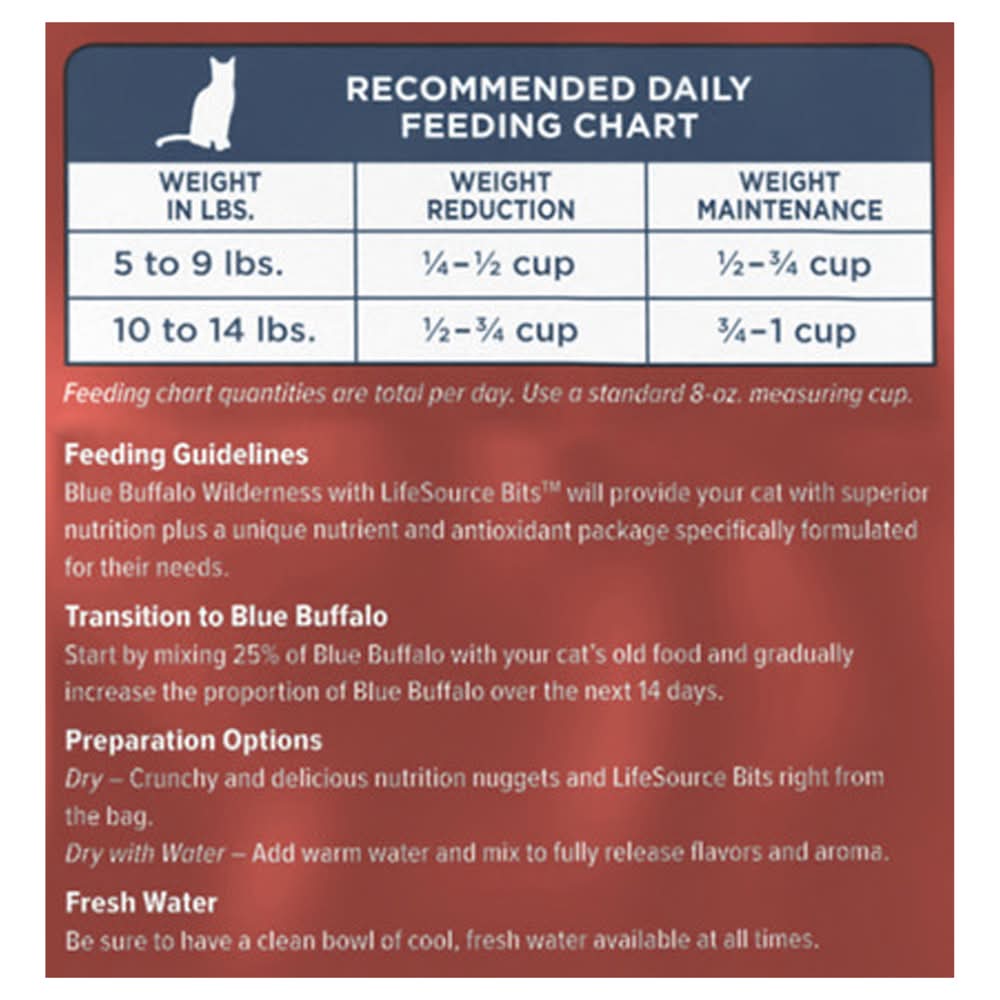 Recommended daily feeding chart: 5-9 lbs: weight reduction: 1/4 - 1/2 cup (use a standard 8-oz. measuring cup.), weight maintenance: 1/2 - 3/4 cup (use a standard 8-oz. measuring cup.) 10-14 lbs: weight reduction: 1/2 - 3/4 cup (use a standard 8-oz. measuring cup.), weight maintenance: 3/4 - 1 cup (use a standard 8-oz. measuring cup.) note: individual cat's requirements may vary from this chart due to age, breed, environment and activity level. adjust food as required to maintain optimal body condition and ask your veterinarian if you are unsure. feeding guidelines: blue wilderness with lifesource bits will provide your cat with superior nutrition plus a unique nutrient and antioxidant package specifically formulated for her needs. transition to blue: start by mixing 25% of blue with your cat's old food, and gradually increase the proportion of blue over the next 14 days. preparation options: dry - crunchy and delicious nutrition nuggets and lifesource bits right from the bag. dry with water - add warm water and mix to fully release flavors and aroma. fresh water: be sure to have a clean dish of cool, fresh water available at all times.