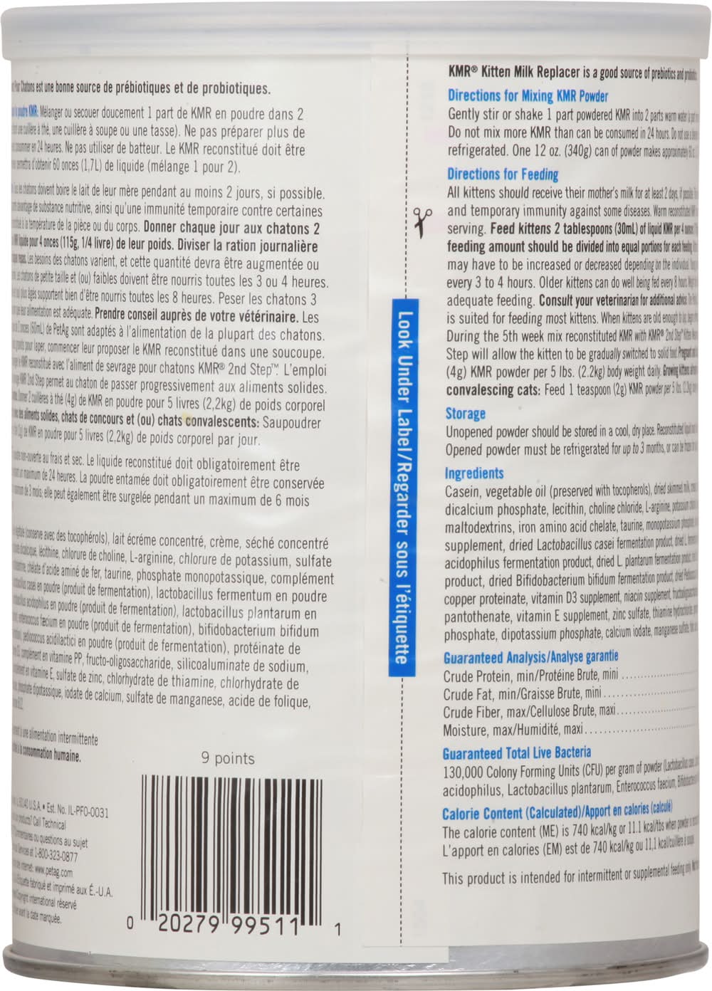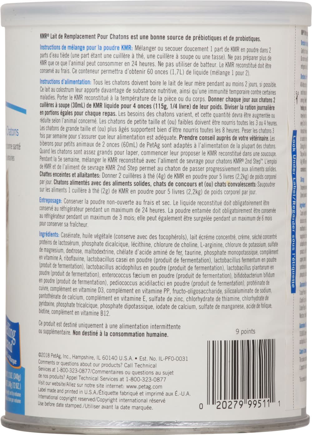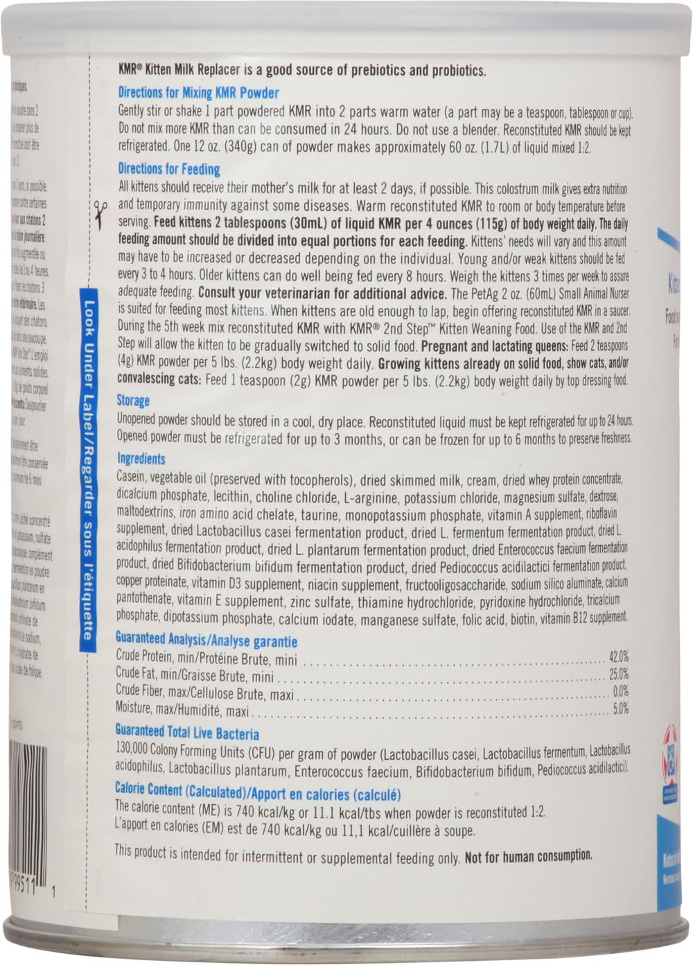 Directions for use: Directions for Mixing KMR Powder: Gently stir or shake 1 part powdered KMR into 2 parts warm water (a part may be a teaspoon, tablespoon or cup). Do not mix more KMR than can be consumed in 24 hours. Do not use a blender. Reconstituted KMR should be kept refrigerated. One 12 oz. (340g) can of powder makes approximately 60 oz. (1.7L) of liquid mixed 1:2. Directions for Feeding: All kittens should receive their mother's milk for at least 2 days, if possible. This colostrum milk gives extra nutrition and temporary immunity against some diseases. Warm reconstituted KMR to room or body temperature before serving. Feed kittens 2 tablespoons (30mL) of liquid KMR per 4 ounces (115g) of body weight daily. The daily feeding amount should be divided into equal portions for each feeding. Kittens' needs will vary and this amount may have to be increased or decreased depending on the individual. Young and/or weak kittens should be fed every 3 to 4 hours. Older kittens can do well being fed every 8 hours. Weigh the kittens 3 times per week to assure adequate feeding. Consult your veterinarian for additional advice. The PetAg 2 oz. (60mL) small Animal Nurser is suited for feeding most kittens. When kittens are old enough to lap, begin offering reconstituted IVAR in a saucer. During the 5th week mix reconstituted KMR with KMR 2nd step Kitten Weaning Food. Use of the KMR and 2nd Step will allow the kitten to be gradually switched to solid food. Pregnant and lactating queens: Feed 2 teaspoons (4g) KMR Powder per 5 lbs. (2.2kg) body weight daily. Growing kittens already on solid food, show cats, and/or convalescing cats: Feed 1 teaspoon (2g) KMR Powder per 5 lbs. (2.2kg) body weight daily by top dressing food. Storage: Unopened powder should be stored in a cool, dry place. Reconstituted liquid must be kept refrigerated for up to 24 hours. Opened powder must be refrigerated for up to 3 months, or can be frozen for up to 6 months to preserve freshness. Use before date stamped. Storage recommendation: Storage: Unopened powder should be stored in a cool, dry place. Reconstituted liquid must be kept refrigerated for up to 24 hours. Opened powder must be refrigerated for up to 3 months, or can be frozen for up to 6 months to preserve freshness.