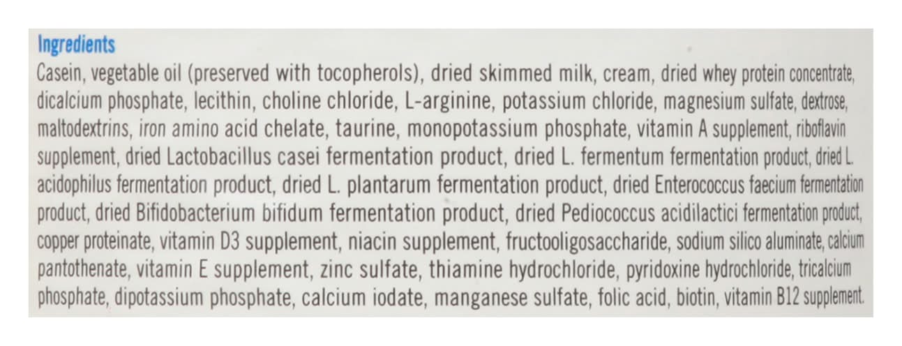 Ingredients: Casein, Vegetable Oil (Preserved with Tocopherols), Dried Skimmed Milk, Cream, Dried Whey Protein Concentrate, Dicalcium Phosphate, Lecithin, Choline Chloride, L-Arginine, Potassium Chloride, Magnesium Sulfate, Dextrose, Maltodextrins, Iron Amino Acid Chelate, Taurine, Monopotassium Phosphate, Vitamin A Supplement, Riboflavin Supplement, Dried Lactobacillus Casei Fermentation Product, Dried L-Fermentum Fermentation Product, Dried L Acidophilus Fermentation Product, Dried L-Plantarum Fermentation Product, Dried Enterococcus Faecium Fermentation Product, Dried Bifidobacterium Bifidum Fermentation Product, Dried Pediococcus Acidilactici Fermentation Product, Copper Proteinate, Vitamin D3 Supplement, Niacin Supplement, Fructooligosaccharide, Sodium Silico Aluminate, Calcium Pantothenate, Vitamin E Supplement, Zinc Sulfate, Thiamine Hydrochloride, Pyridoxine Hydrochloride, Tricalcium Phosphate, Dipotassium Phosphate, Calcium Iodate, Manganese Sulfate, Folic Acid, Biotin, Vitamin B12 Supplement