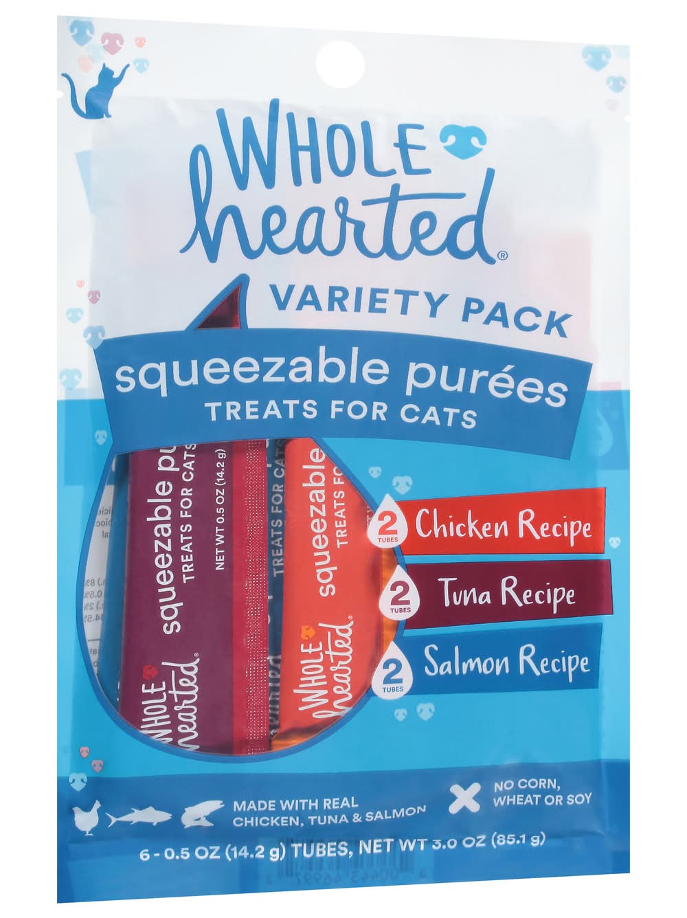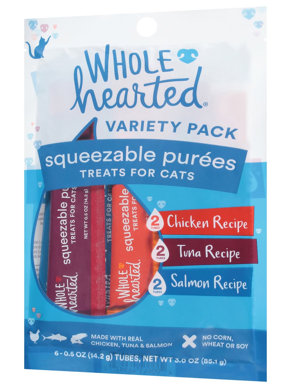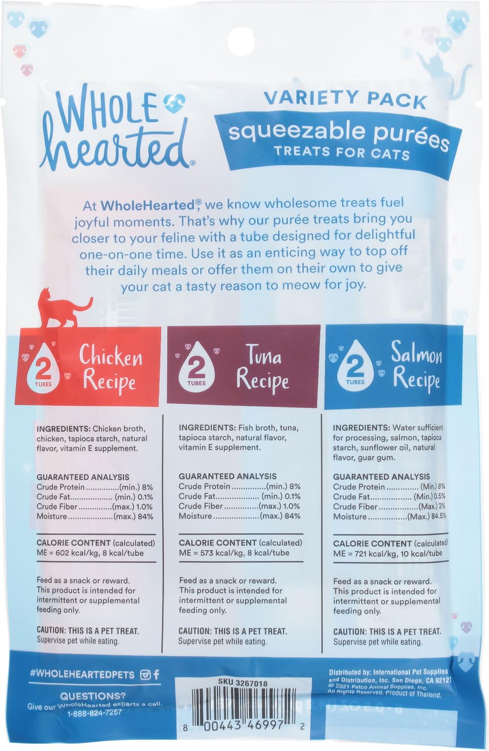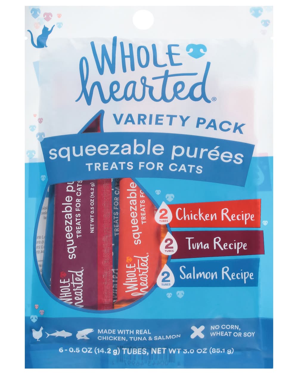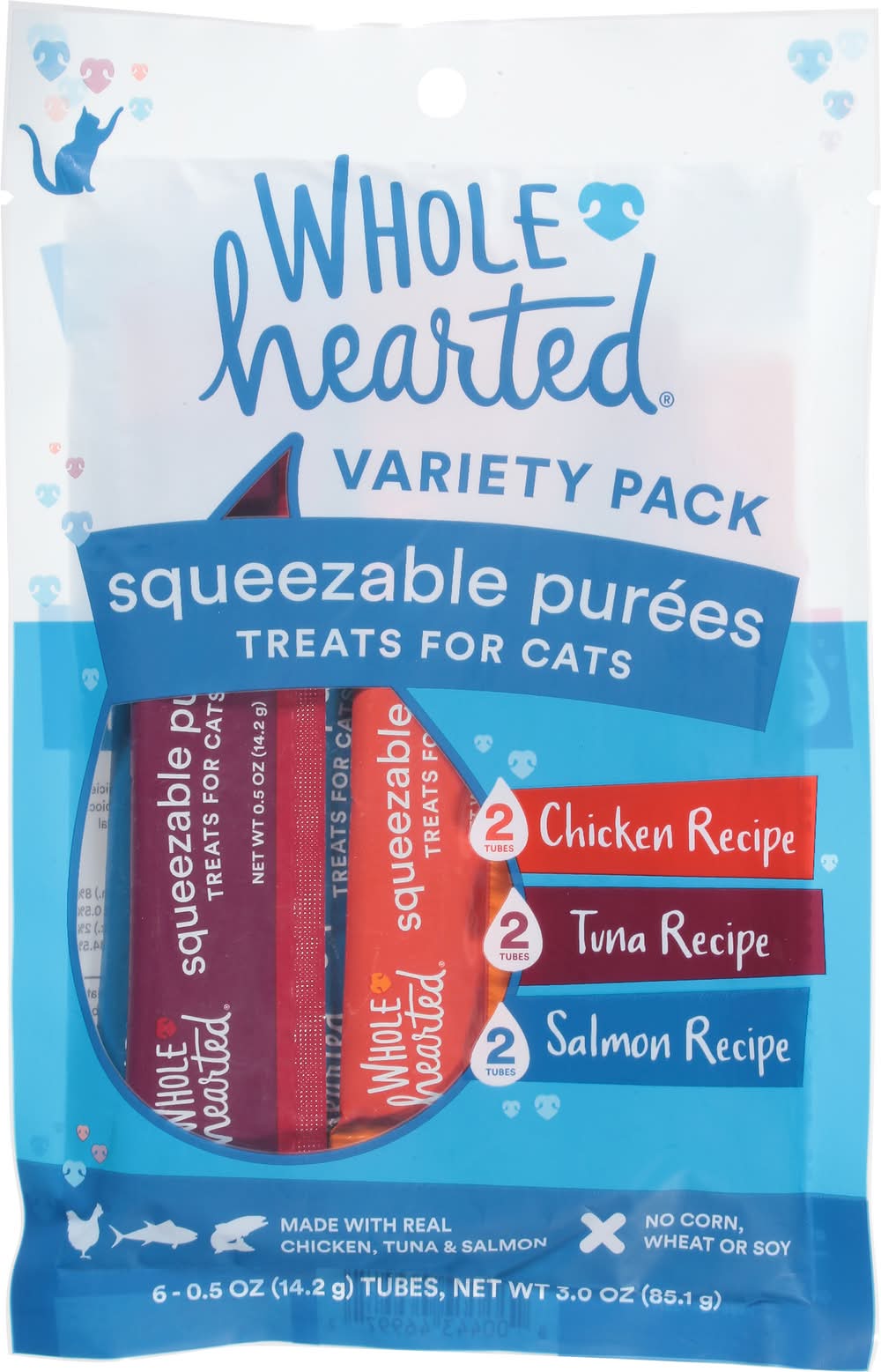WholeHearted Squeezable Puree Cat Treat Variety pack Chicken Recipe Tuna Recipe Salmon Recipe (0.5 oz, 6 ct)