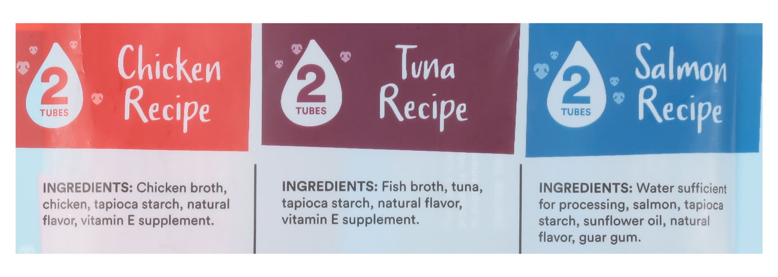 Ingredients: Chicken Recipe: Chicken Broth, Chicken, Tapioca Starch, Natural Flavor, Vitamin E Supplement. Tuna Recipe: Fish Broth, Tuna, Tapioca Starch, Natural Flavor, Vitamin E Supplement. Salmon Recipe: Water Sufficient for Processing, Salmon, Tapioca Starch, Sunflower Oil, Natural Flavor, Guar Gum Contains: Fish, Tuna, Fish, Fish, Salmon
