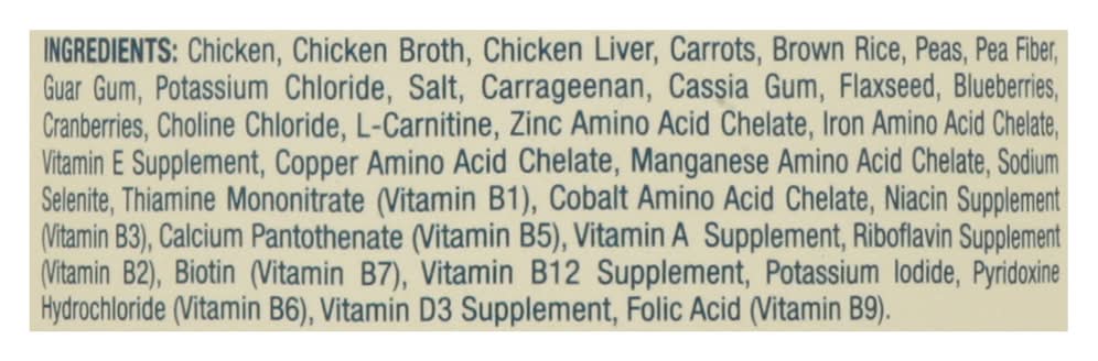 Ingredients: Chicken, Chicken Broth, Chicken Liver, Carrots, Brown Rice, Peas, Pea Fiber, Guar Gum, Potassium Chloride, Salt, Carrageenan, Cassia Gum, Flaxseed, Blueberries, Cranberries, Choline Chloride, L-Carnitine, Zinc Amino Acid Chelate, Iron Amino Acid Chelate, Vitamin E Supplement, Copper Amino Acid Chelate, Manganese Amino Acid Chelate, Sodium Selenite, Thiamine Mononitrate (Vitamin B1), Cobalt Amino Acid Chelate, Niacin Supplement (Vitamin B3), Calcium Pantothenate (Vitamin B5), Vitamin A Supplement, Riboflavin Supplement (Vitamin B2), Biotin (Vitamin B7), Vitamin B12 Supplement, Potassium Iodide, Pyridoxine Hydrochloride (Vitamin B6), Vitamin D3 Supplement, Folic Acid (Vitamin (B9)